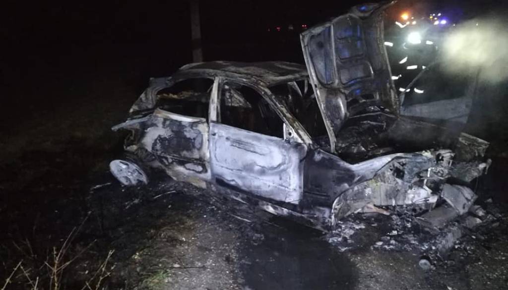 Ob tem se je avtomobil prevrnil na streho in še naprej drsel čez odvodni kanal ter trčil v žično zaščitno ograjo, ko sta voznik in sopotnik padla iz vozila. Avtomobil je nato zagorel in v celoti zgorel, so policisti opisali nesrečo.