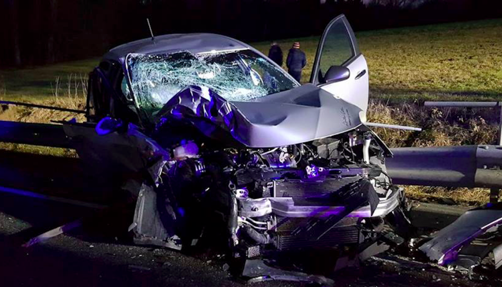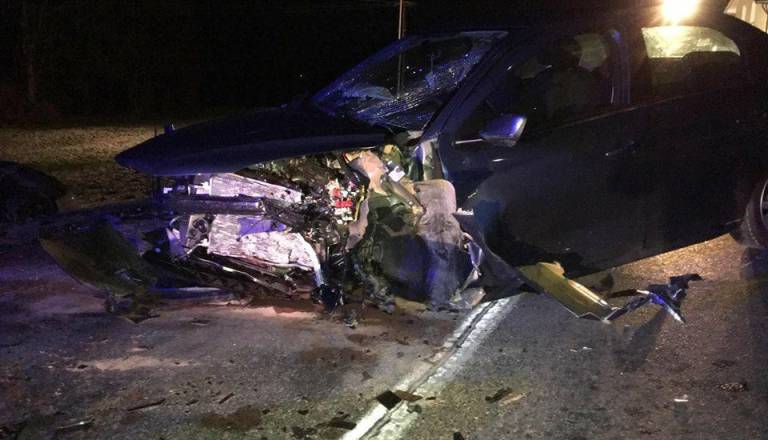V čelnem trčenju dveh avtomobilov je ena oseba utrpela hujše telesne poškodbe. Gasilci so vozilo morali dvigniti iz zaščitne ograje.