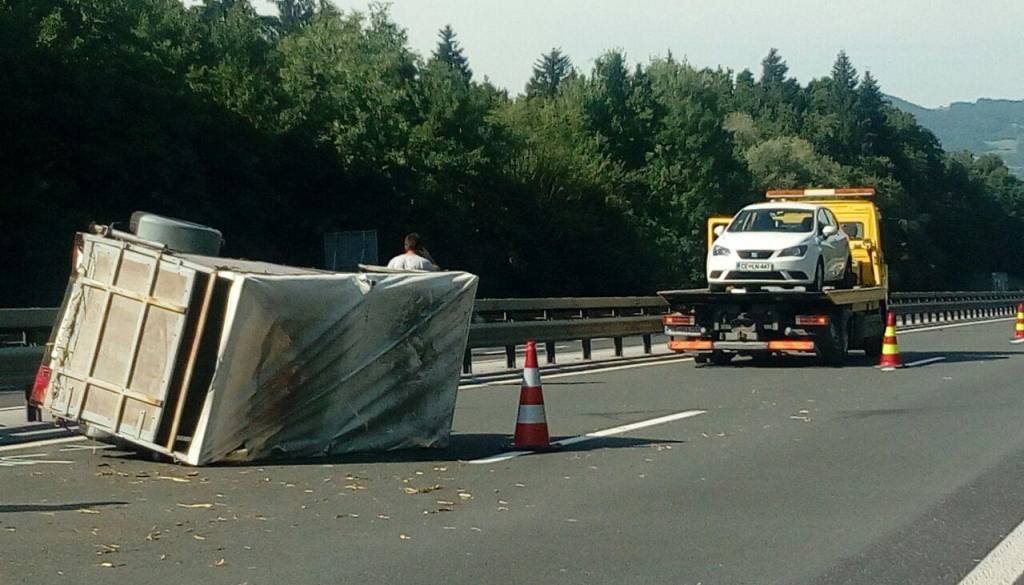 Kot so sporočili iz Uprave RS za zaščito in reševanje, sta na viaduktu Peloge na AC v smeri Slovenska Bitrica - Tepanje, občina Slovenska Bistrica trčili osebni vozili. Eno od teh je imelo priklopljeno prikolico za prevoz živine, na kateri je bilo 10 prašičev, ki se je prevrnila. Pri tem je ena od živali poginila. Posredovali so gasilci iz PGD Slovenska Bistrica. Poškodovanih oseb ni bilo.