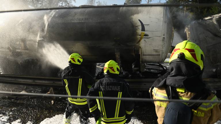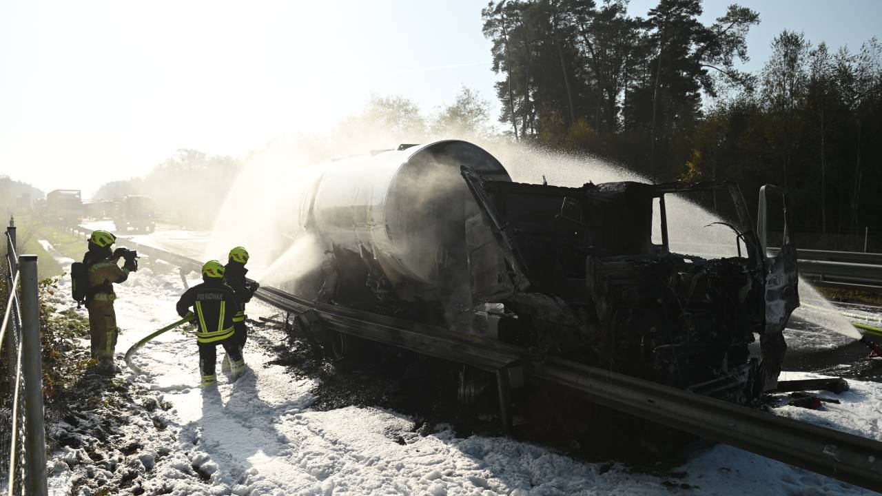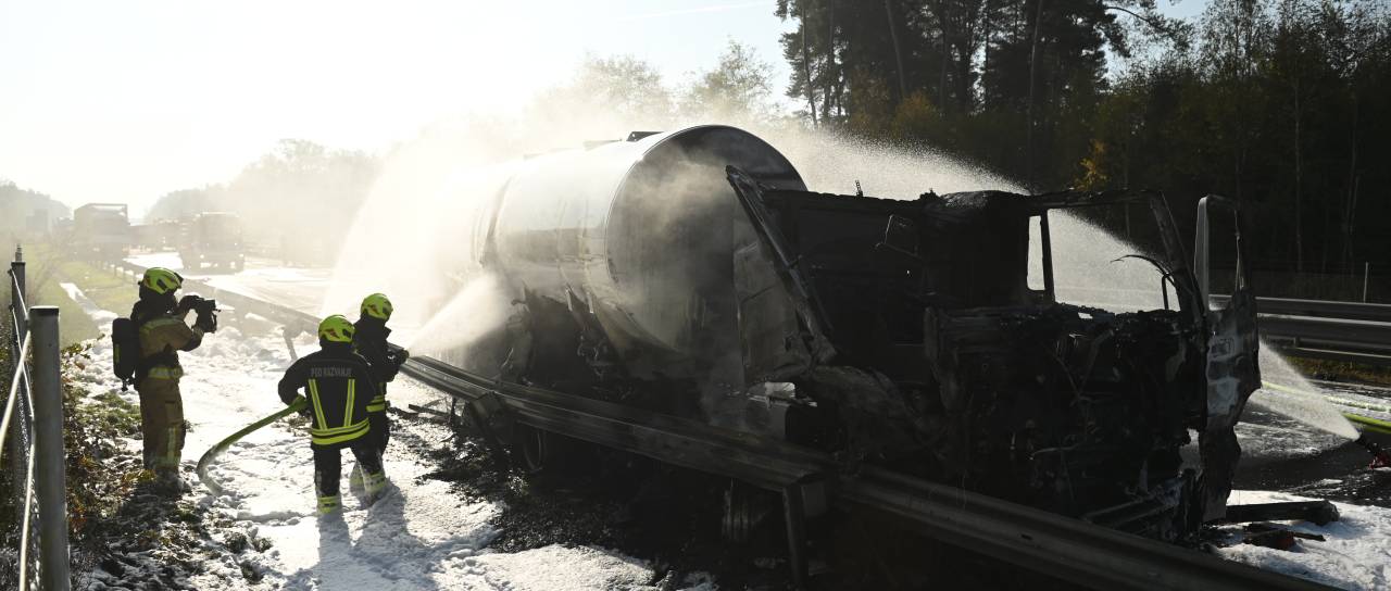 Pri tem je eno tovorno vozilo (cisterna), ki je prevažalo kurilno olje, zagorelo. Gasilci so požar že omejili.