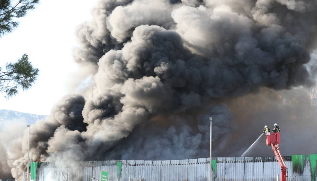 V skladišču podjetja Pevex v Splitsko-dalmatinski županiji je izbruhnil obsežen požar. Gasilci skušajo preprečiti širjenje ognja.