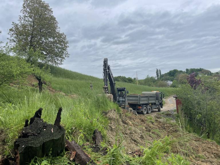 Po tem ko je minister Marjan Šarec včeraj zvečer ob obisku Pesnice in Šentilja napovedal pomoč Slovenske vojske, so danes dopoldne pripadniki inženirske enote Slovenske vojske z bagerji in tovornjaki prispeli v občino Šentilj.