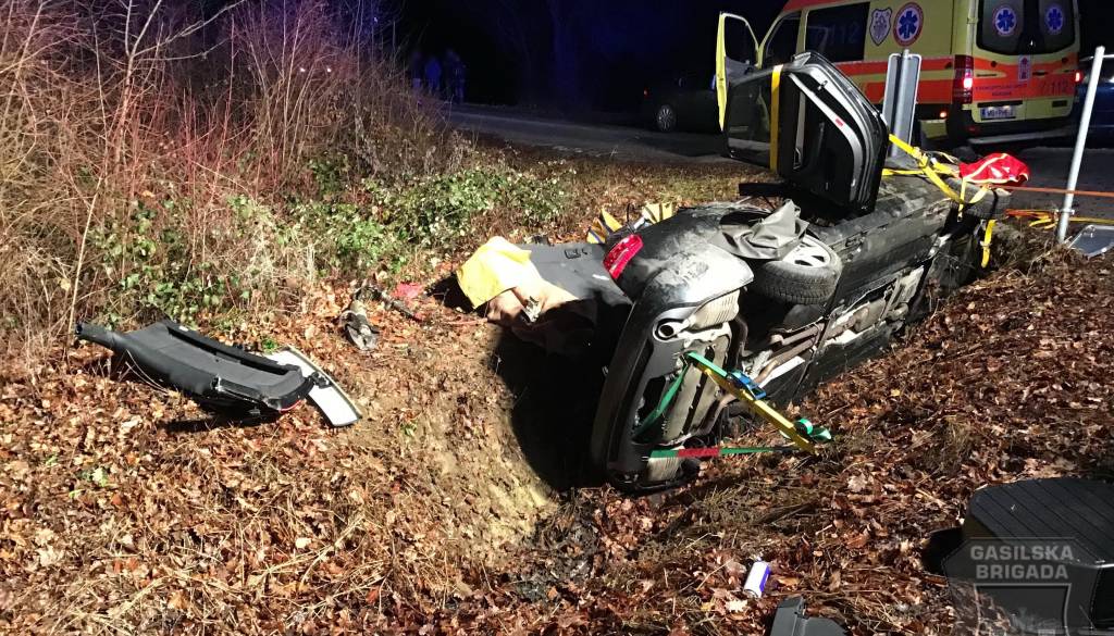 Tam je vozilo zdrsnilo v obcestni jarek in trčilo v prometni znak bočne ovire in nato še v betonski kanal ter tam obstalo prevrnjeno na levem boku.