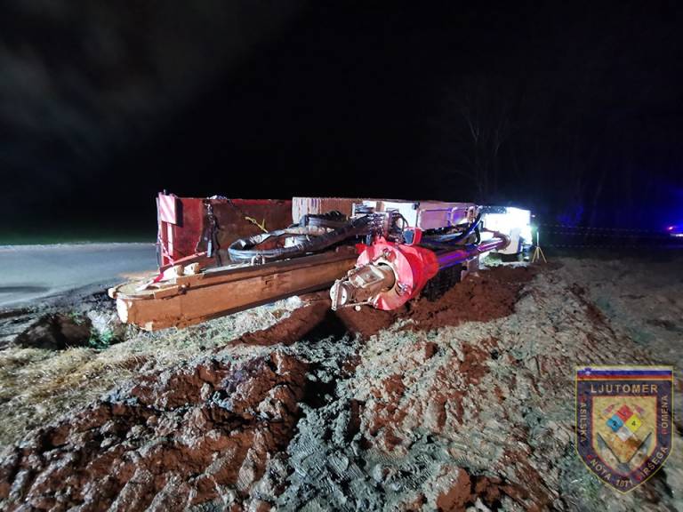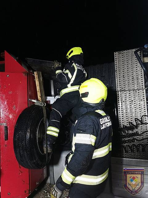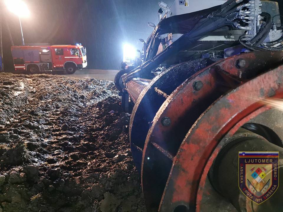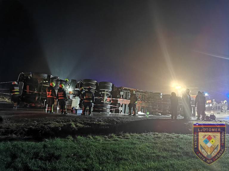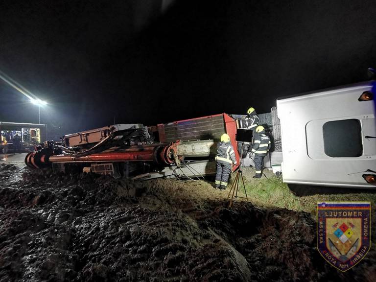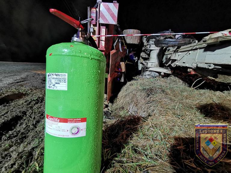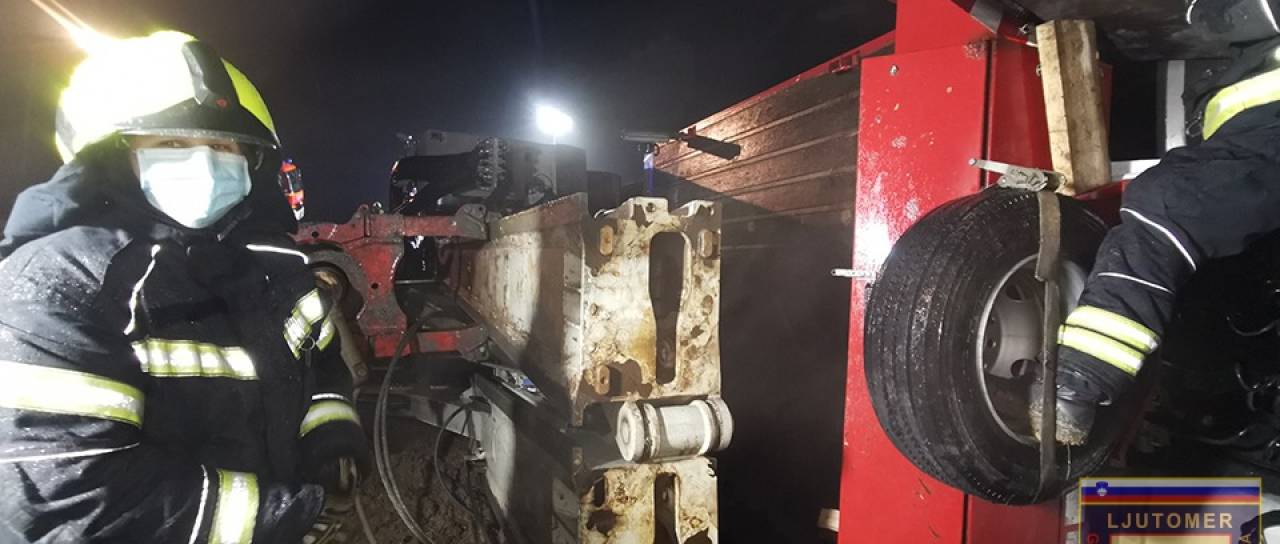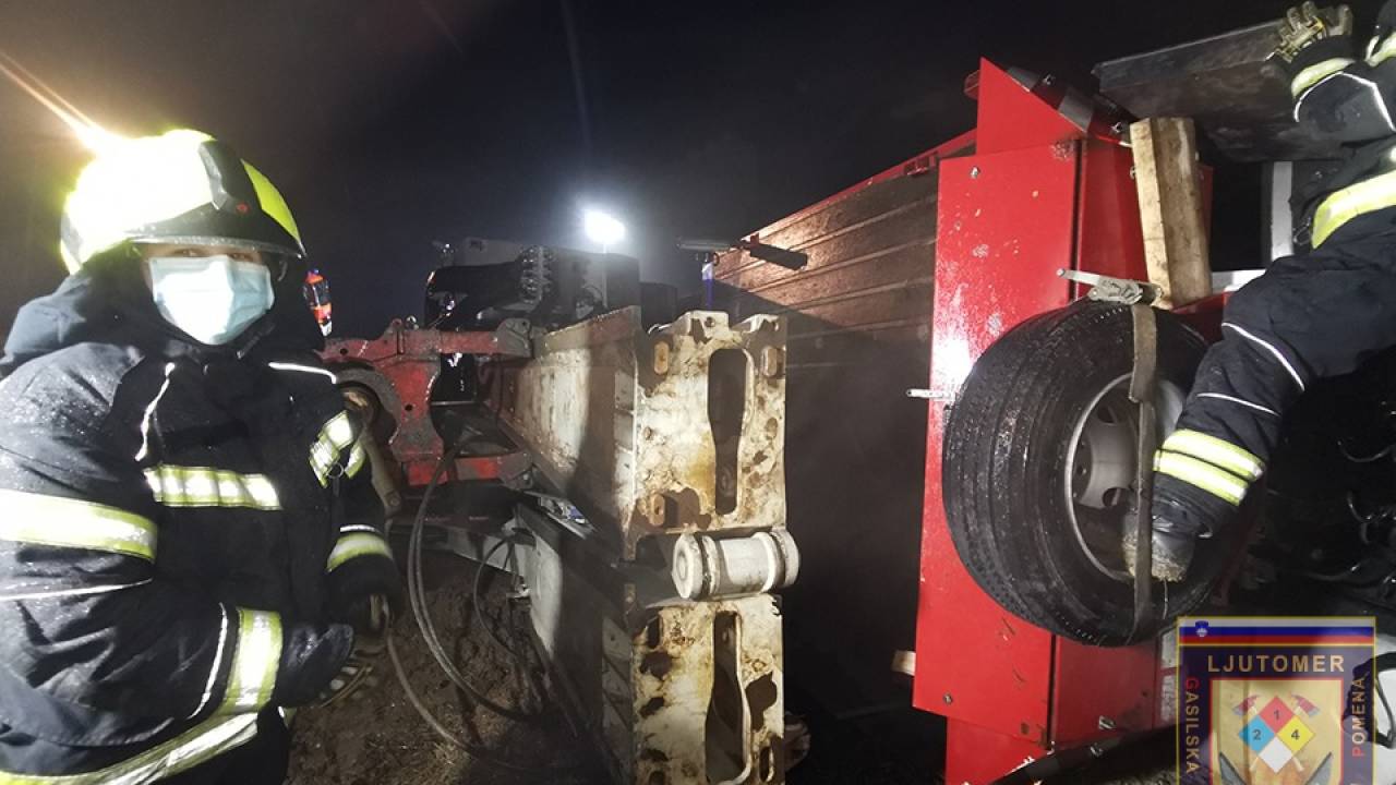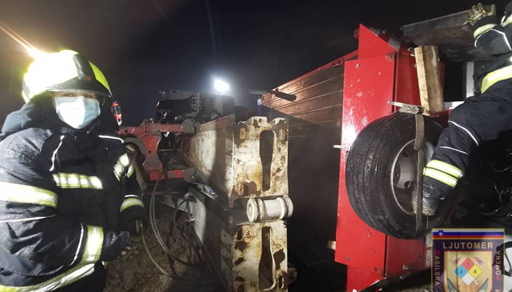 Ormoški in ljutomerski gasilci so pri prometni nesreči posredovali včeraj ob 18.00, ko se je prevrnil tovornjak z delovnim strojem. Iz tovornjaka je iztekalo pogonsko gorivo, iz delovnega stroja pa hidravlično olje.