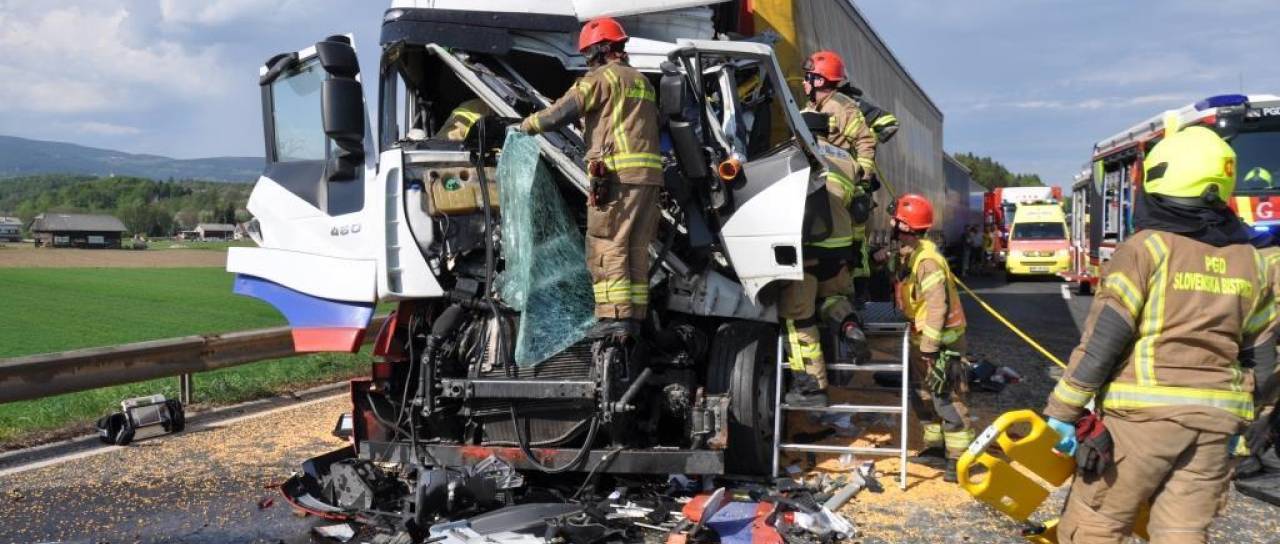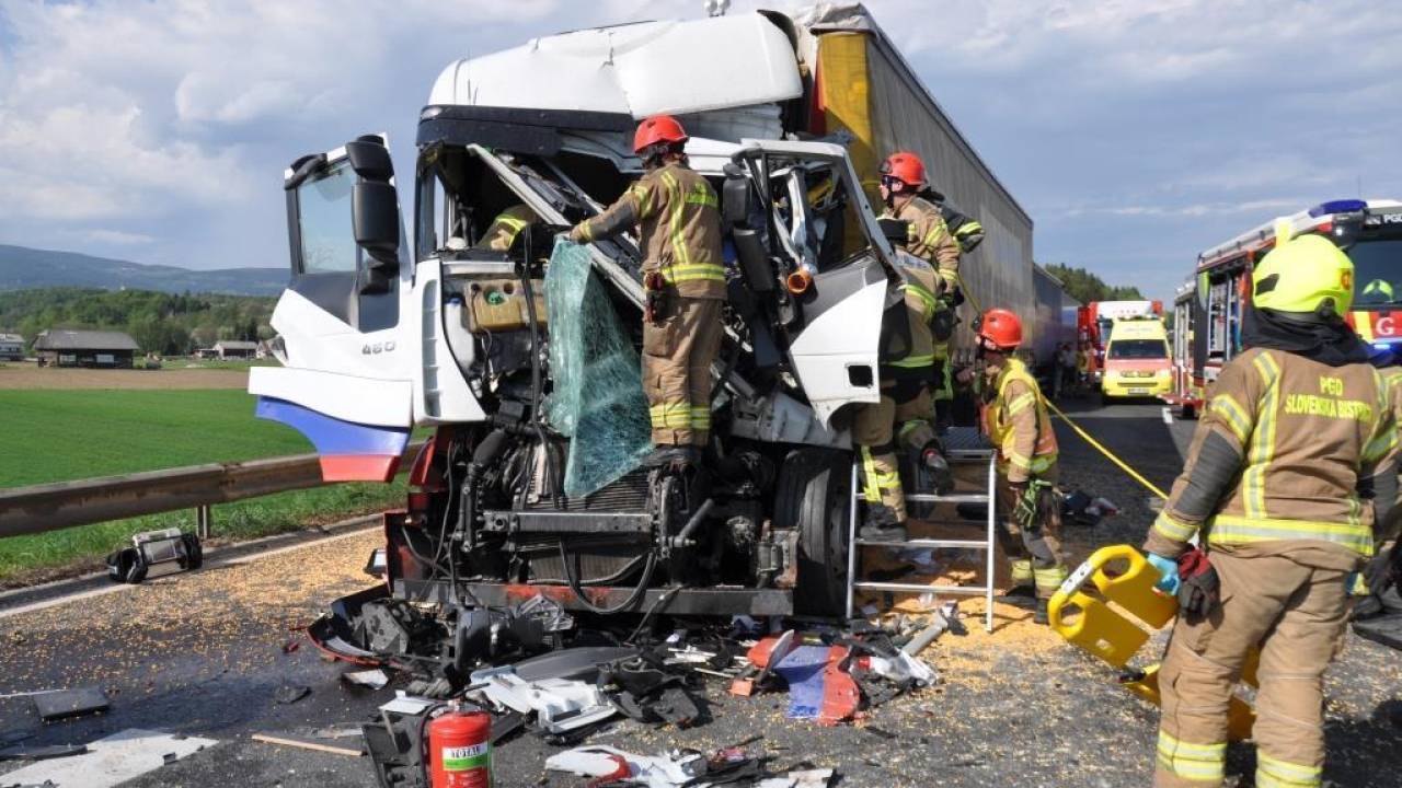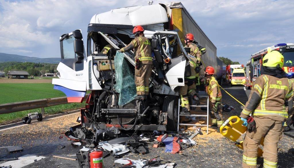 Ob 15.50 je v Spodnjem Grušovju v občini Slovenske Konjice na avtocesti med Slovensko Bistrico in Tepanjem prišlo do trčenja petih tovornih vozil.