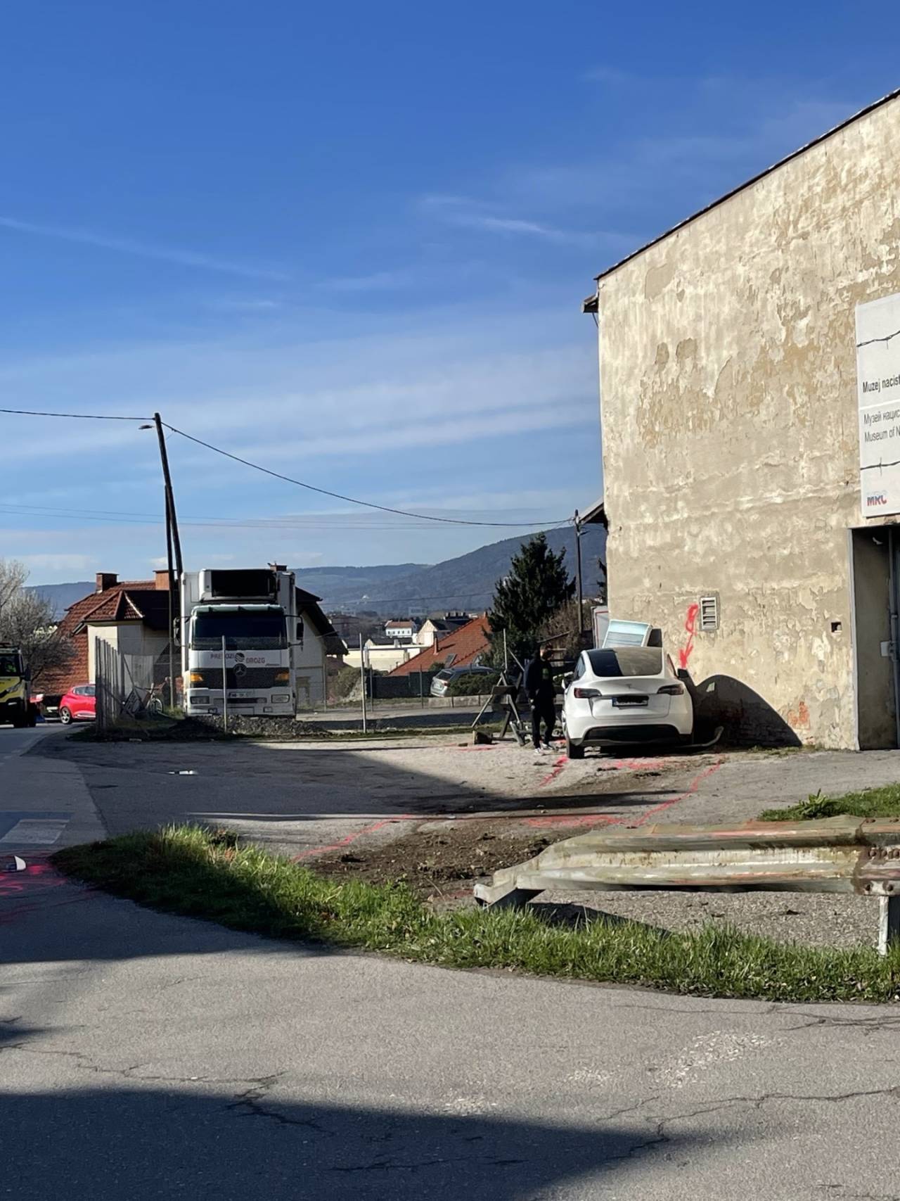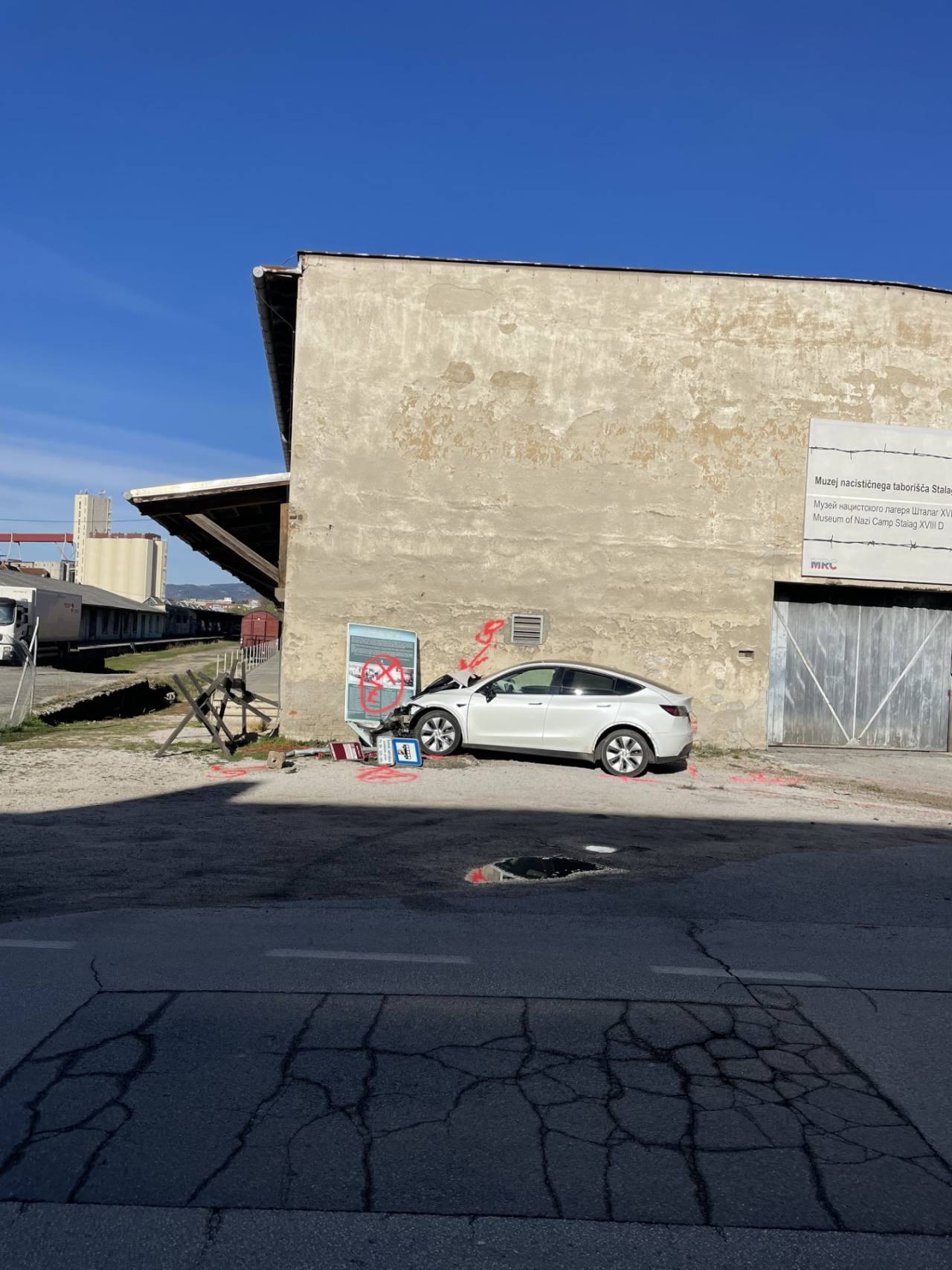 Tako je zapeljal čez križišče in 'skočil' skozi varovalno ograjo in trčil naravnost v Muzej nacističnega taborišča Stalag.