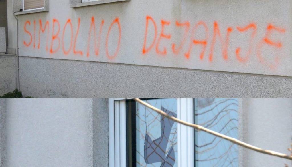 Fasado stavbe so po naših podatkih popisali z napisoma 'Klic na pomoč' in 'Simbolno dejanje' ter razbili več stekel.