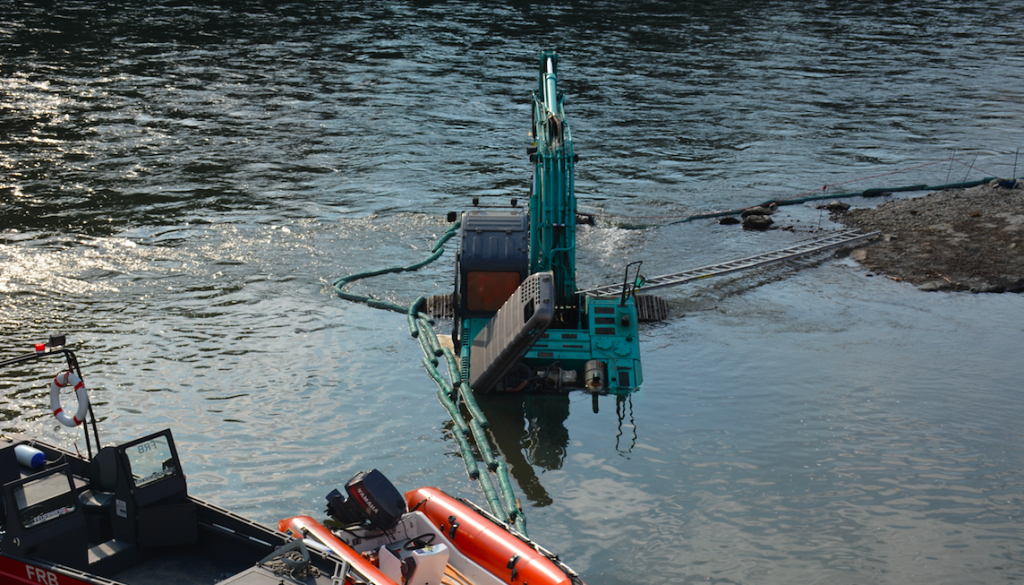 V zgodnjih jutranjih urah se je v strugo reko pričel pogrezati 16-tonski bager. V vodi sta trenutno dva čolna, aktivirani so tudi potapljači.