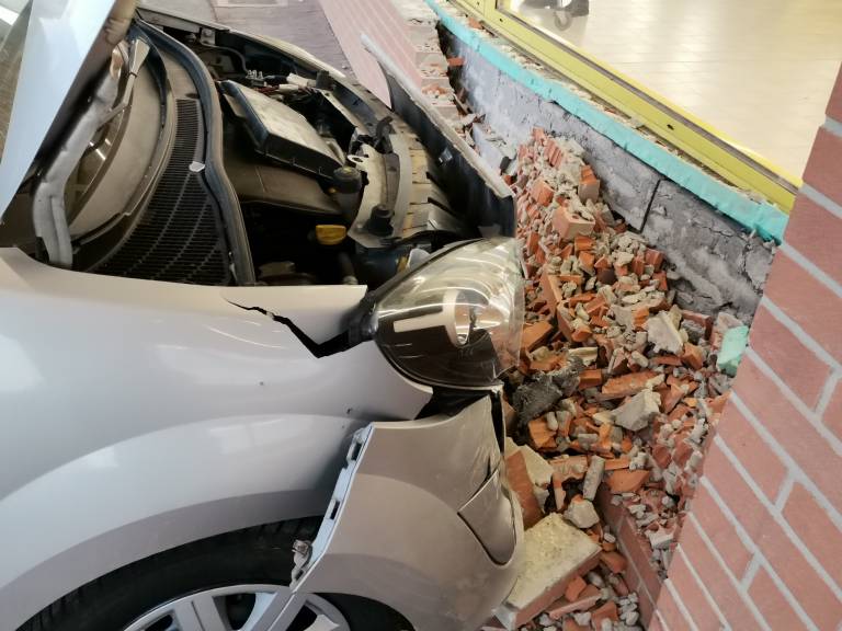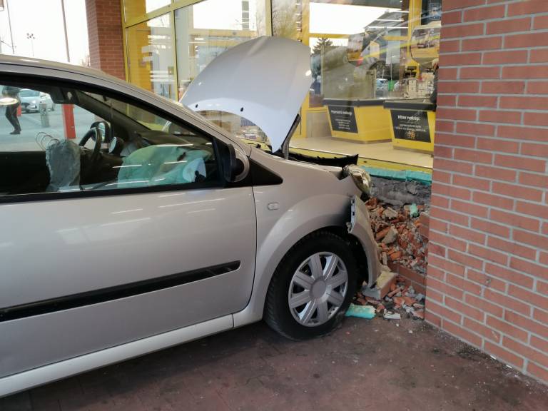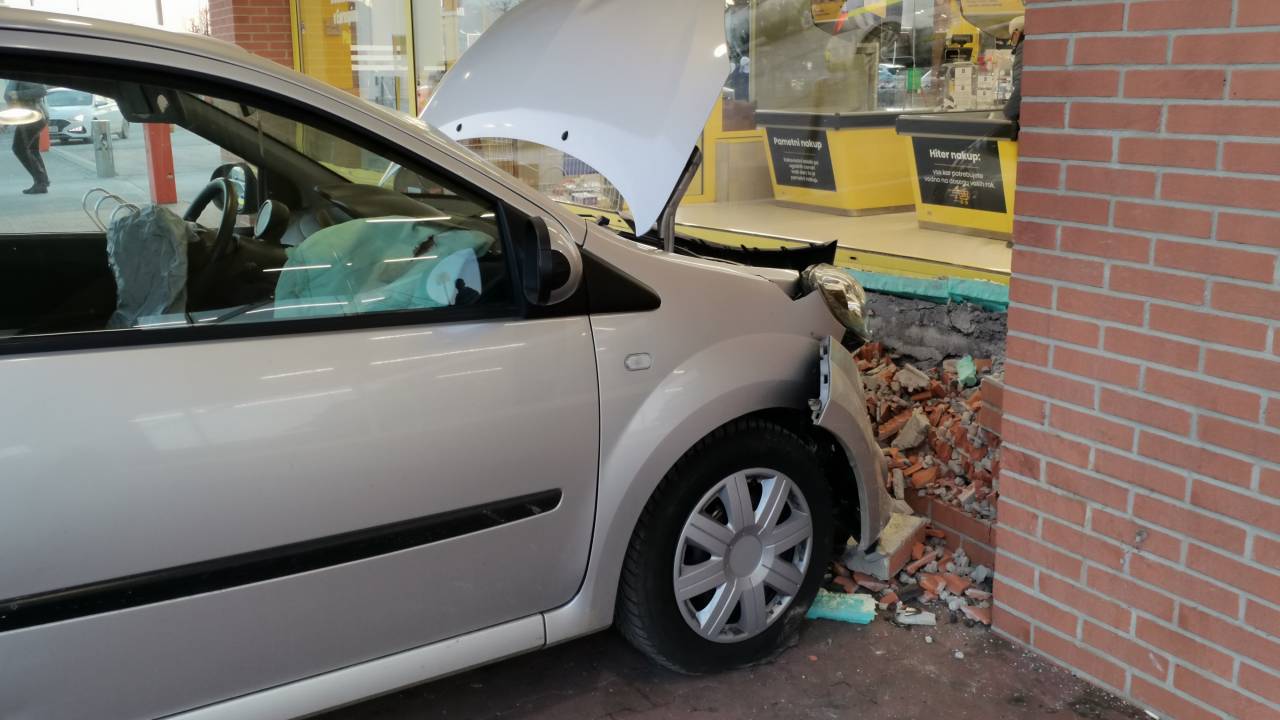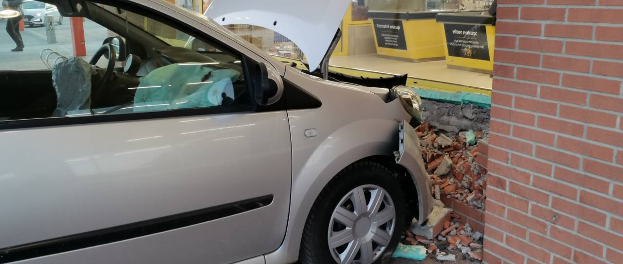 Ob 14.21 se je voznica z osebnim vozilom zaletela v pročelje trgovine z živili.