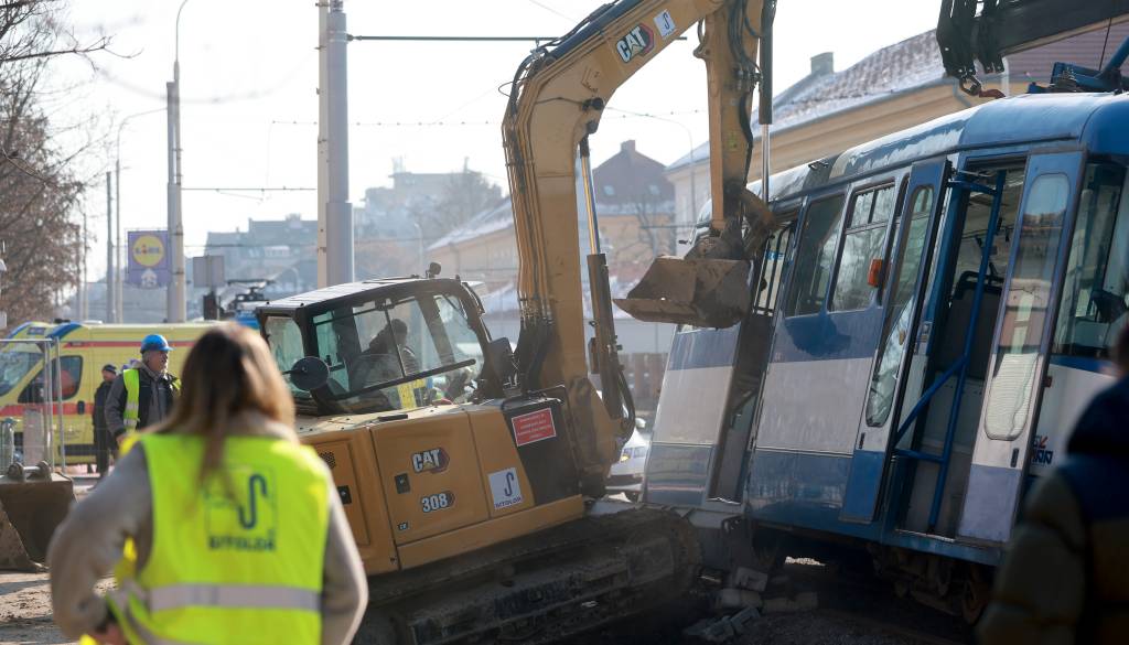 Bager je zadel tramvaj, ki je se je nato nagnil proti cestišču.