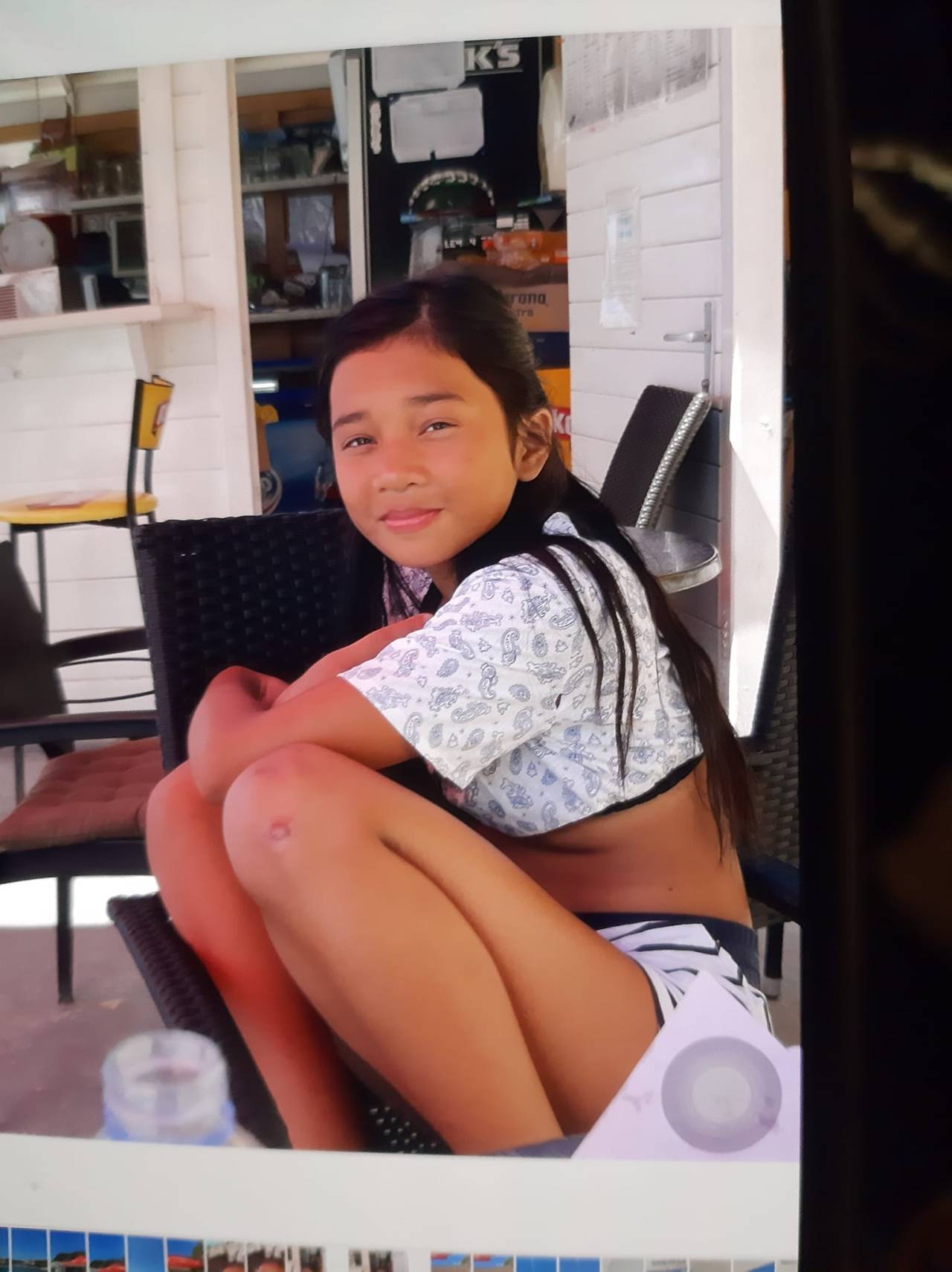 Deklica je visoka približno 150 centimetrov, je temnejše polti in ima temne lase, saj je Filipinka.