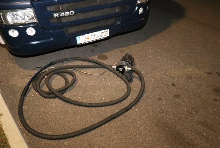 Tovorno vozilo je bilo zaustavljeno v Grabonošu, pri ogledu pa je v njem bila najdena črpalka in pribor za črpanje goriva.