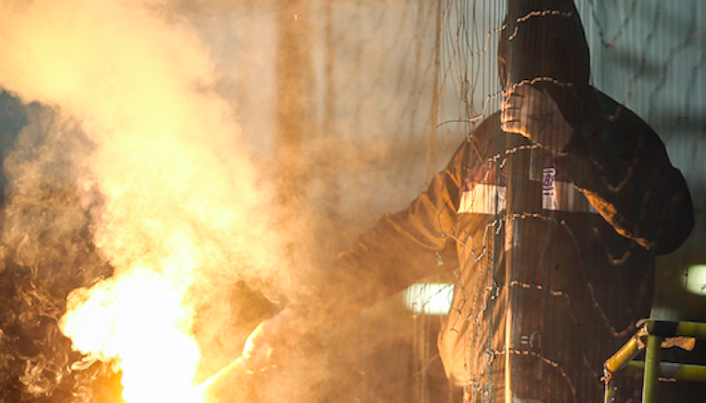 Organizirani navijači so se posredovanju policistov aktivno upirali, in sicer tako da so v može v modrem metali različne predmete, ki so jih imeli pri roki. Pri tem so lahko telesno poškodovali šest policistov.