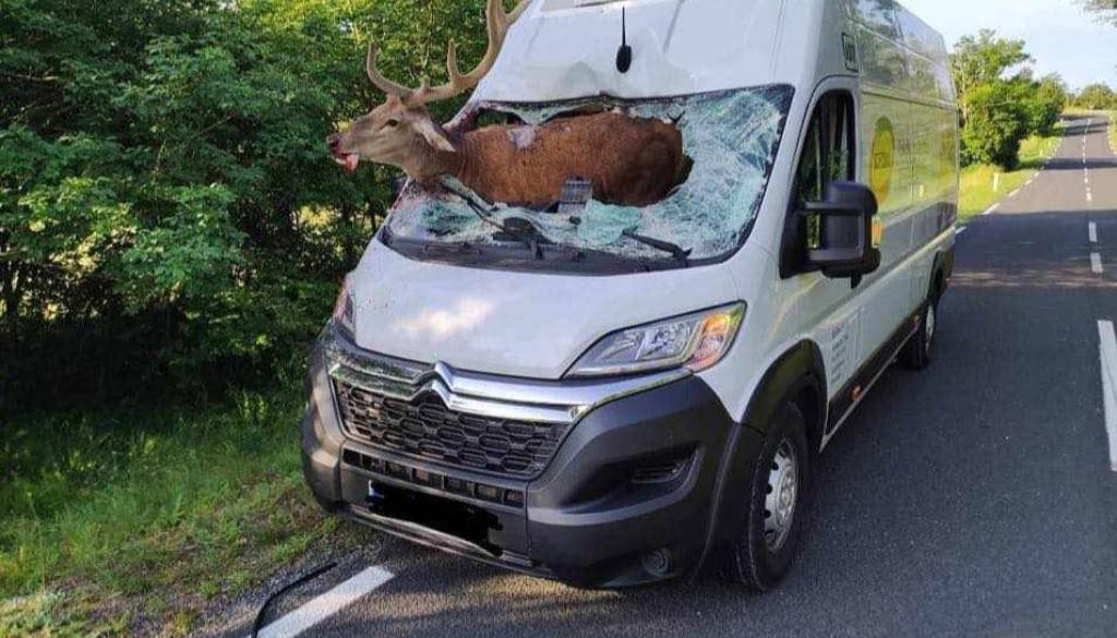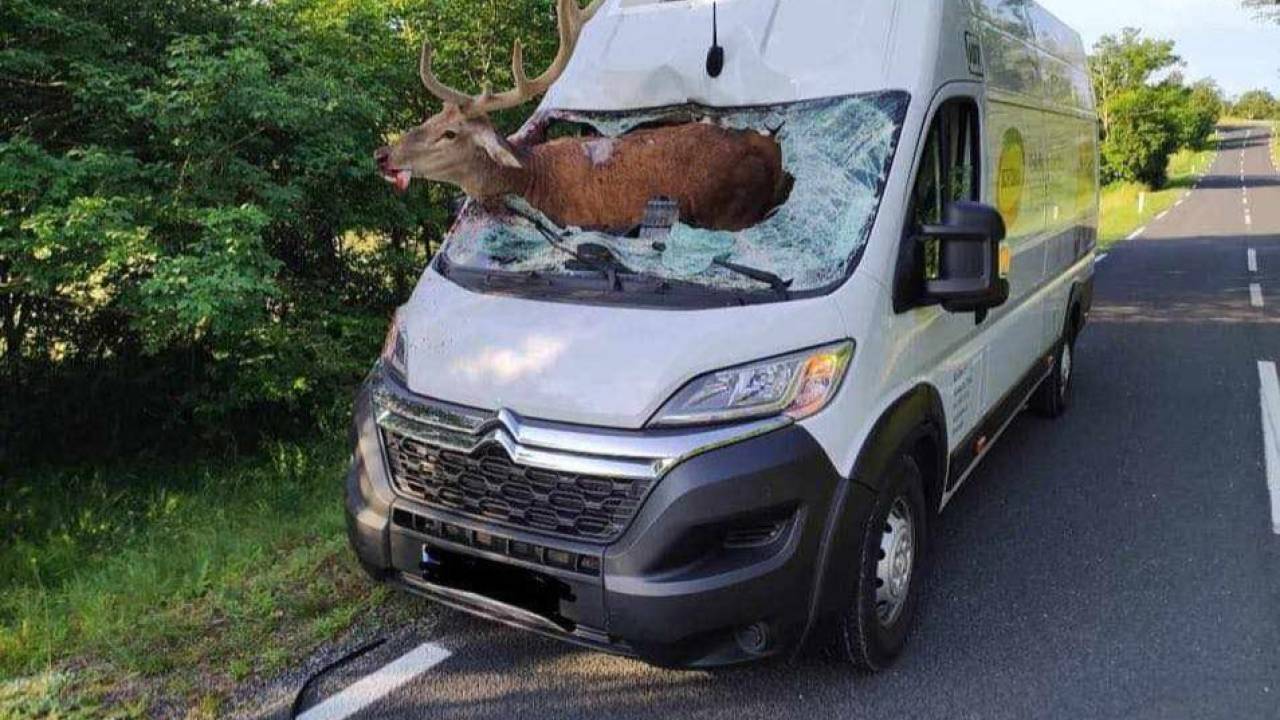 Velik, odrasel jelen je nenadoma skočil na cesto in s tako silo trčil v kombi, da je prebil vetrobransko steklo ter pristal na voznikovem sedežu.