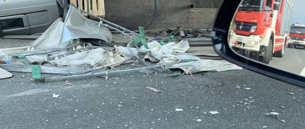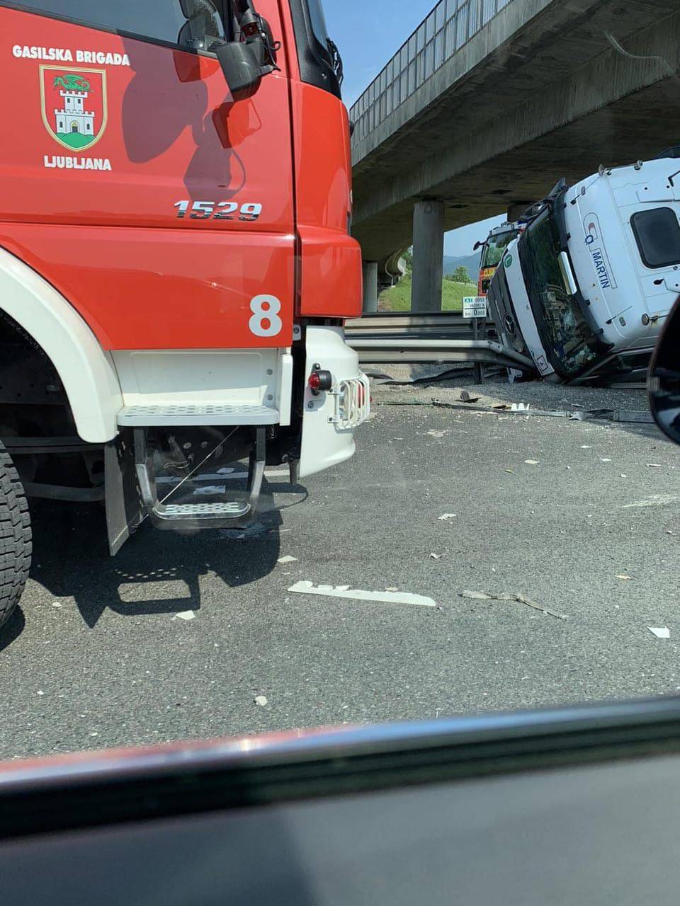 Po poročanju Uprave Republike Slovenije za zaščito in reševanje se je ob tem odpel natovorjen kolut pločevine, ki se je skotalil po cestišču in poškodoval dve osebni vozili.