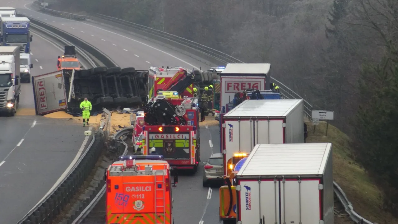 Avtocesta je bila zaprta zaradi dopoldanske nesreče, ko se je prevrnilo tovorno vozilo in prebilo zaščitno ograjo.