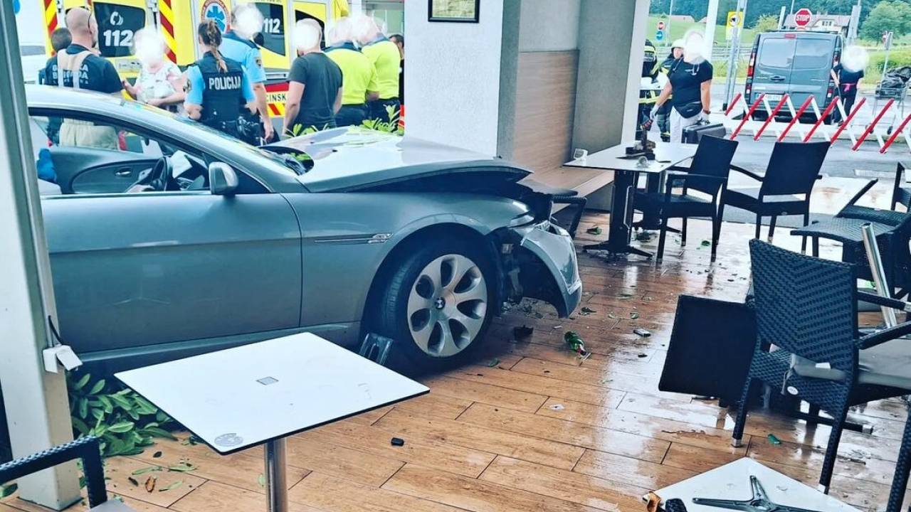 Ljubljanski policisti poročajo o nesreči, v kateri je močno vinjen voznik z avtom trčil v montažno steno gostinskega lokala, v katerem je bilo takrat več gostov.