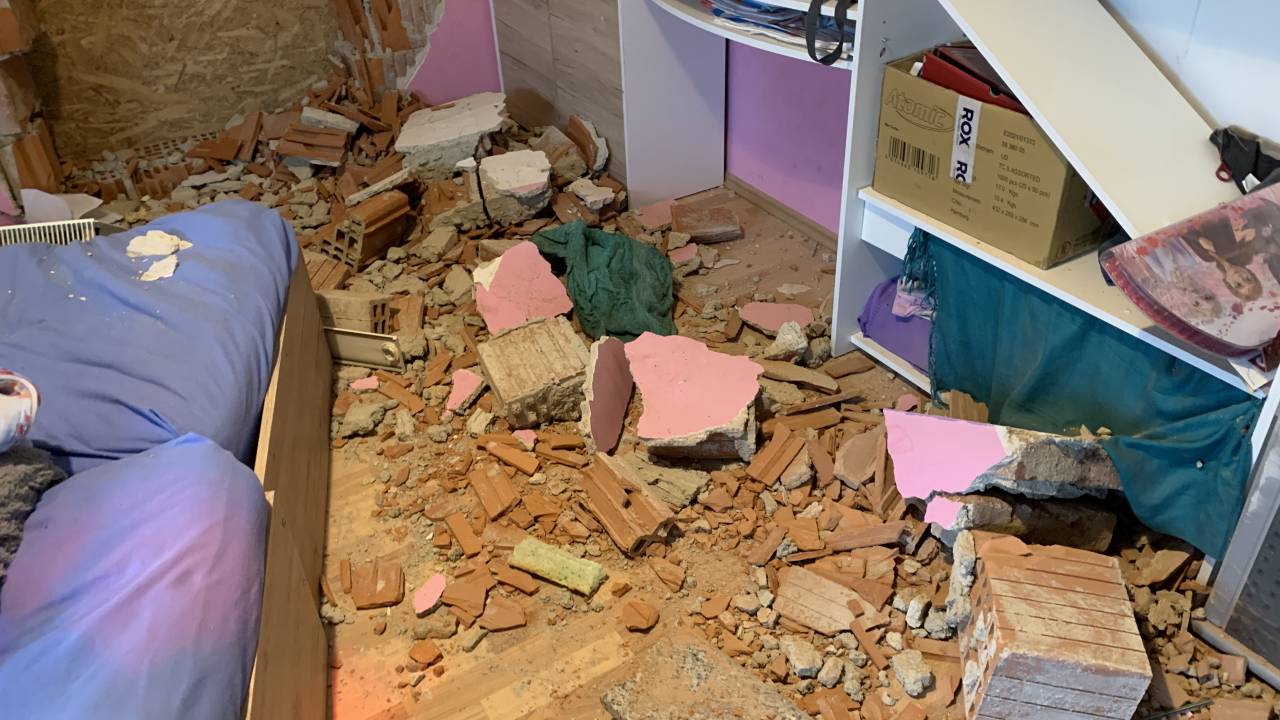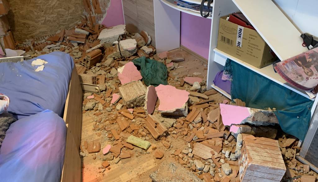 Zidake in dele stene je vrglo nekaj metrov v notranjost otroške sobe, kjer sicer spita 8- in 9-letni sestri, ki ju k sreči v trenutku trčenja ni bilo v postelji.