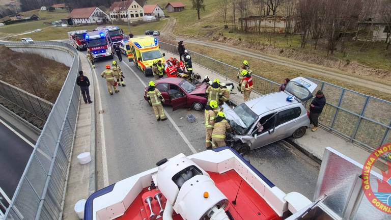Na nadvozu nad avtocesto sta trčili osebni vozili. Dve osebi sta utrpeli poškodbe in bili prepeljani v bolnišnico.