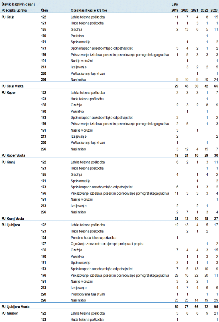 V spodnji tabeli je prikazano število obravnavanih kaznivih dejanj, po izbranih členih, katerih žrtev je bila mladoletna oseba, osumljen pa je bil vsaj en mladoletnik.