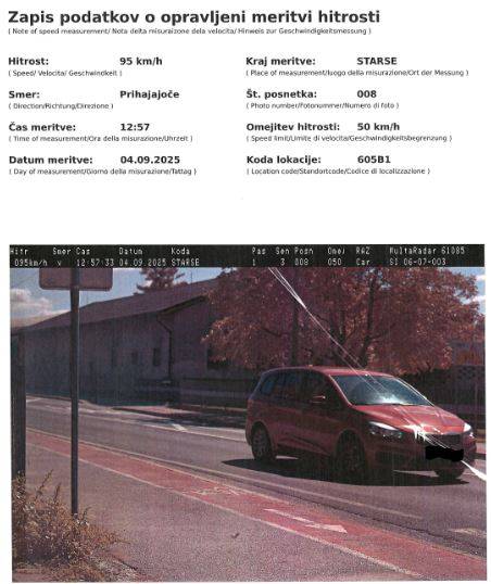 Tako so mariborski policisti včeraj, 4. septembra 2025 izvajali poostren nadzor hitrosti z merilnikom hitrosti na regionalni cesti v neposredni bližini osnovne šole na območju Starš pri Mariboru, kjer je hitrost vozil omejena na 50 kilometrov na uro.