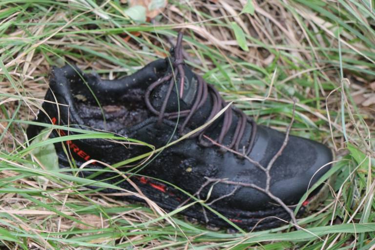 Oblečen je bil v polo majico modre barve z napisom, spodnji del trenerke modrosive barve, obute je imel štiri sloje nogavic in športne čevlje znamke Merrell, številka 42, črne barve z rdečo črto.