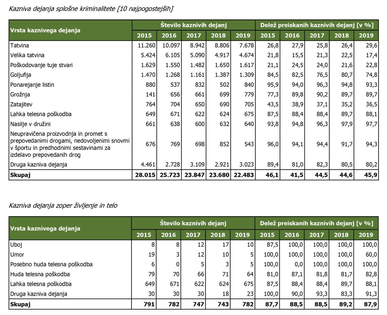 Na področju kaznivih dejanj so policisti na ravni države v prvem polletju 2019 obravnavali največ tatvin (7.678), velikih tatvin (4.674), poškodovanj tujih stvari (1.617), goljufij (1.309) in ponarejanj listin (840). Pri kaznivih dejanjih zoper življenje in telo so obravnavali 10 ubojev in 5 umorov, kar je manj kot v primerljivem obdobju lani (17 ubojev in 10 umorov).
