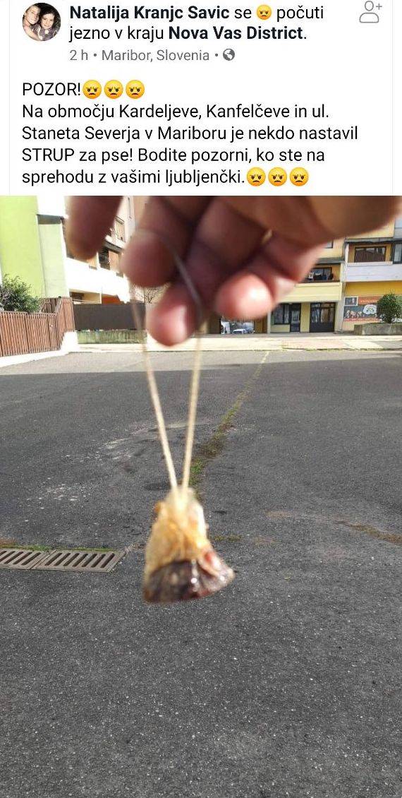 Na družbenem omrežju Facebook smo zasledili, da nekdo ponovno nastavlja strup za pse. Najditeljica je zapisala, da je bil strup najden na območju Kardeljeve ulice, Kanfelčeve ulice in ulice Staneta Severja. Bodite previdni!