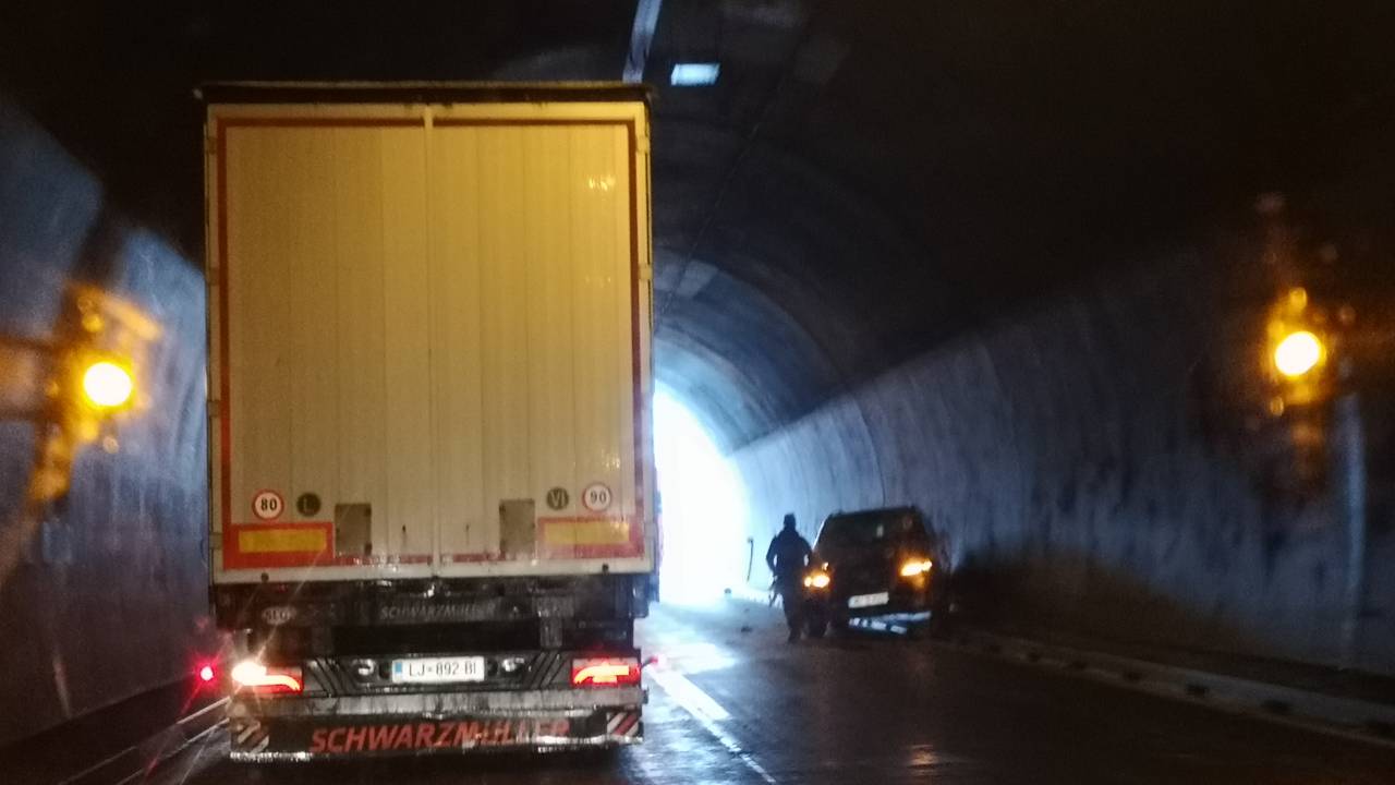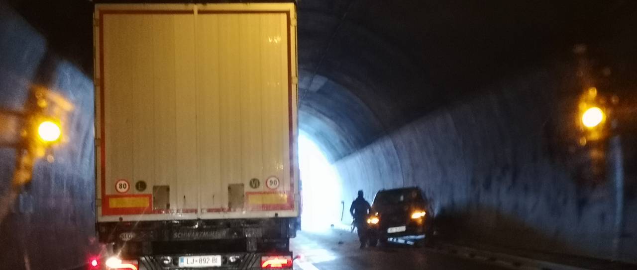 Zaradi tega je zapeljal v levo in z vozilom trčil betonsko steno predora. Od tam je vozilo odbilo v desno, ga obrnilo in mu odtrgalo pripeto priklopno vozilo. Osebni avtomobil je nato trčil še v steno predora.