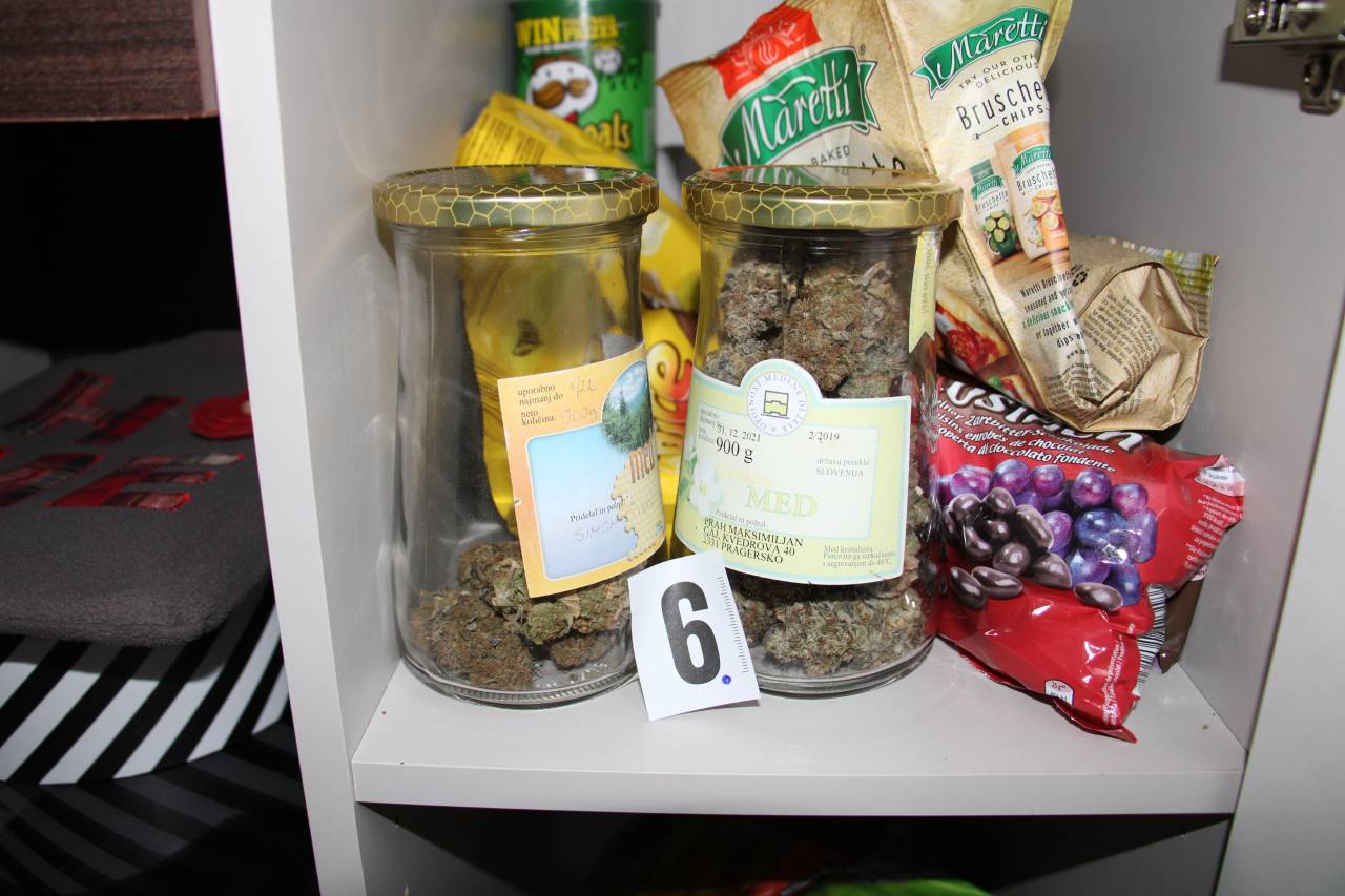 V poslopju so odkrili približno dva kilograma posušenih rastlinskih delcev rjavo zelene barve, za katere sumijo, da so delci prepovedane droge konoplje, tehtnico in električni mešalnik.