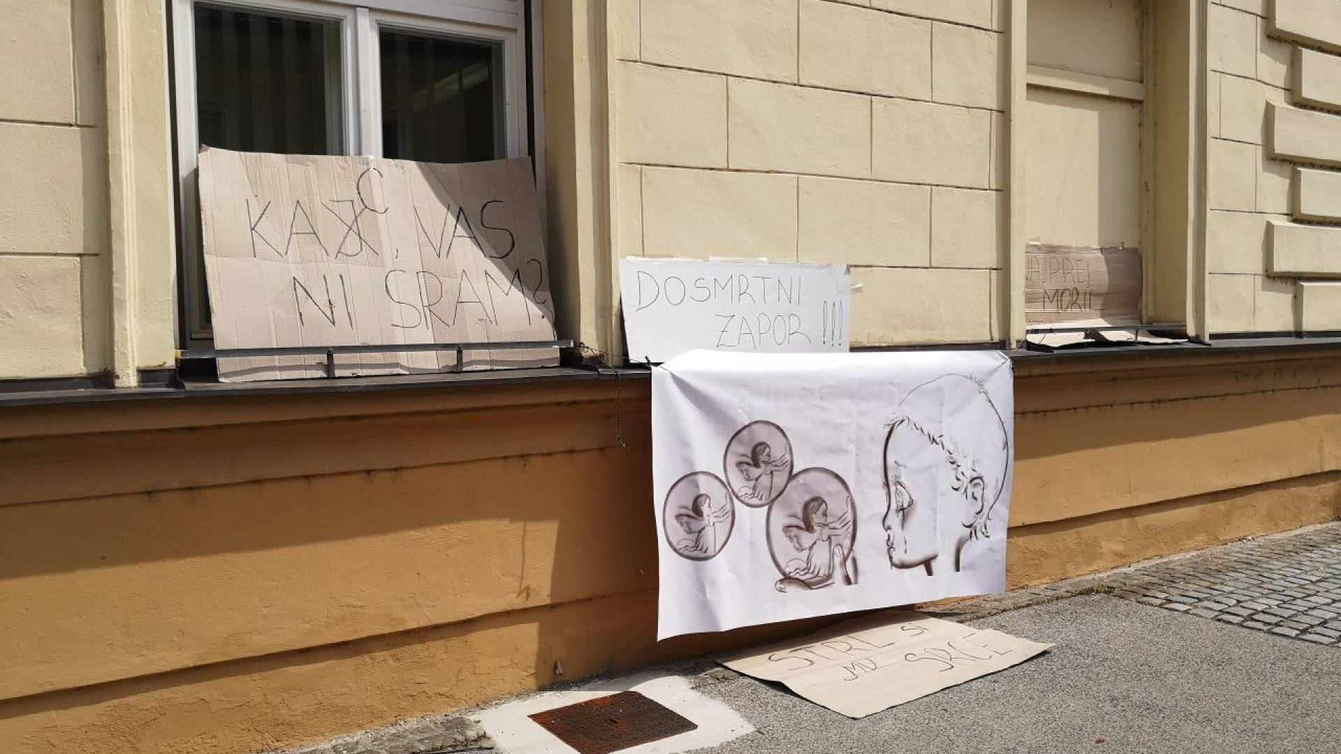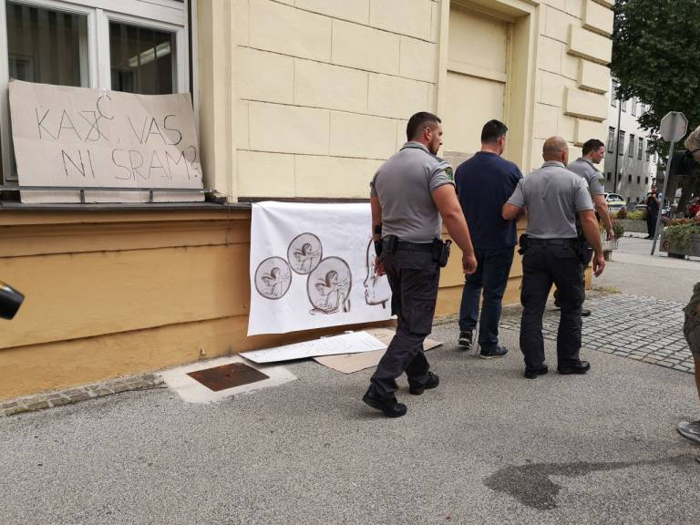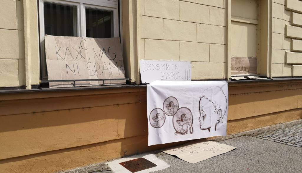 Ob robu današnjega izreka kazenske sankcije Silvu Drevenšku v ponovljenem sojenju so prijatelji, svojci in znanci umorjene nekdanje partnerke ter pred očmi štiriletnega sina še umorjenih tašče in tasta, krvniku trojice s pomočjo transparentov poslali sporočila.