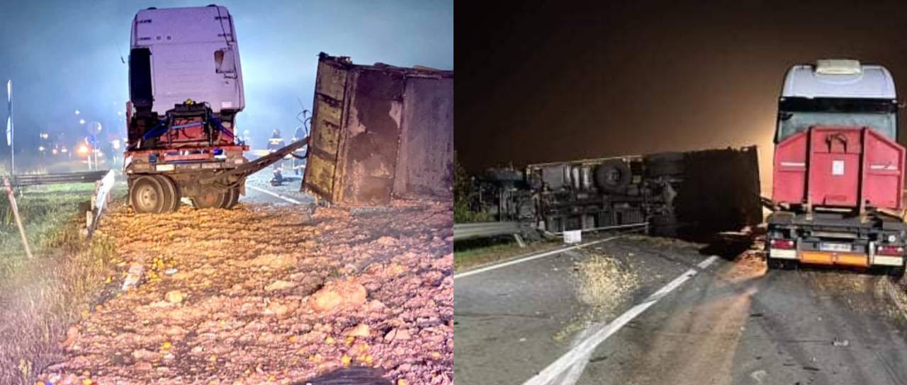 Voznik osebnega avtomobila je zaradi prevelike hitrosti trčil v tovorno vozilo. Pri tem se je tovorno vozilo prevrnilo na bok, iz njega pa se je na cesto razsulo deset ton bioloških odpadkov.