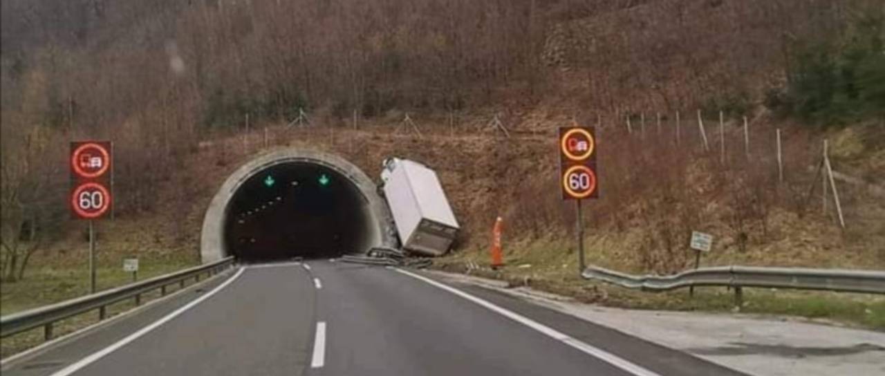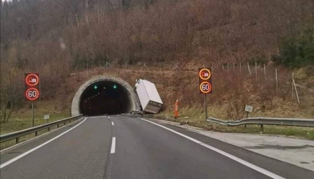 30-letni voznik tovornega vozila je zaradi vožnje preblizu desnega roba vozišča pri uvozu v tunel trčil v rob tunela.