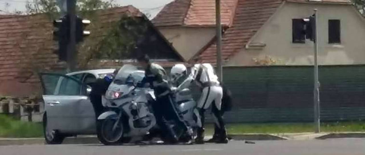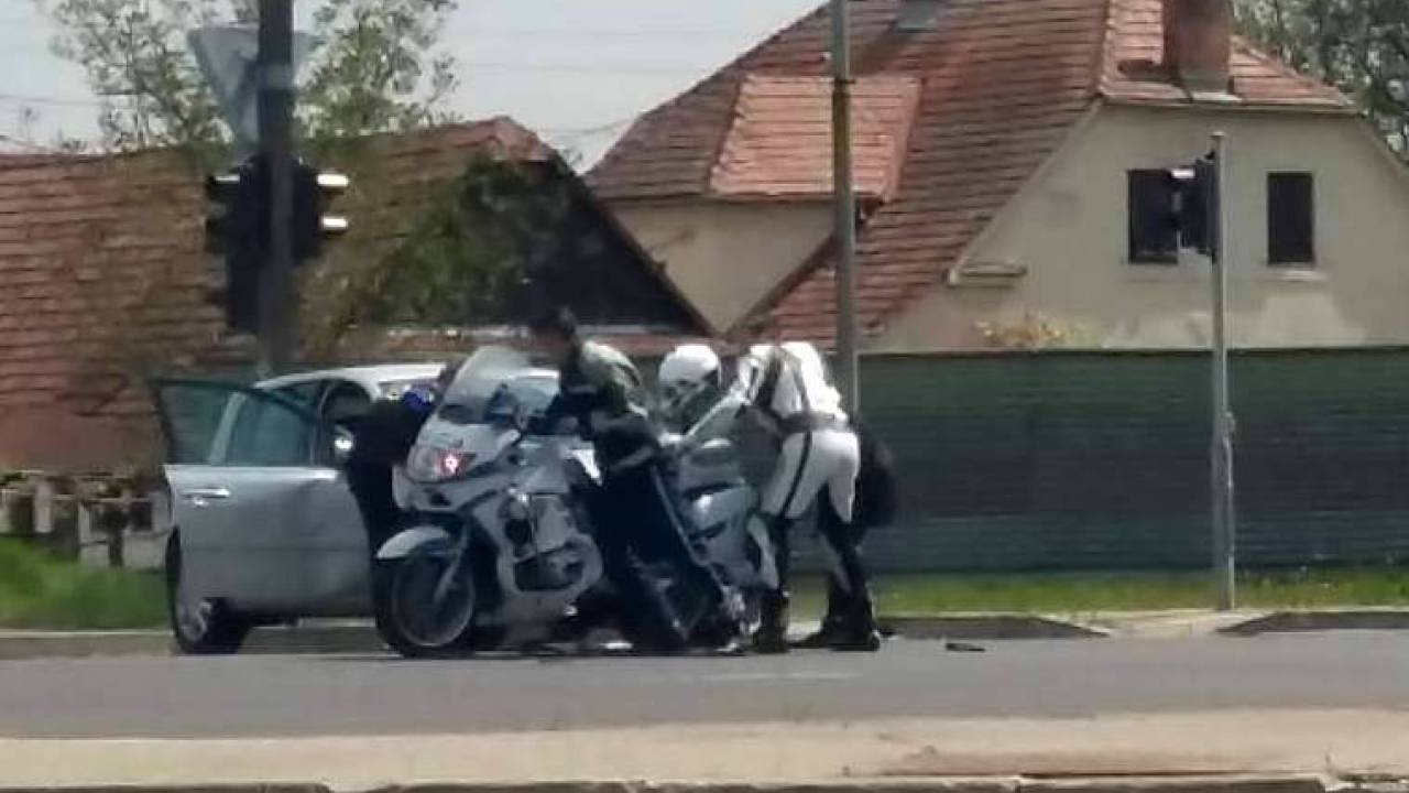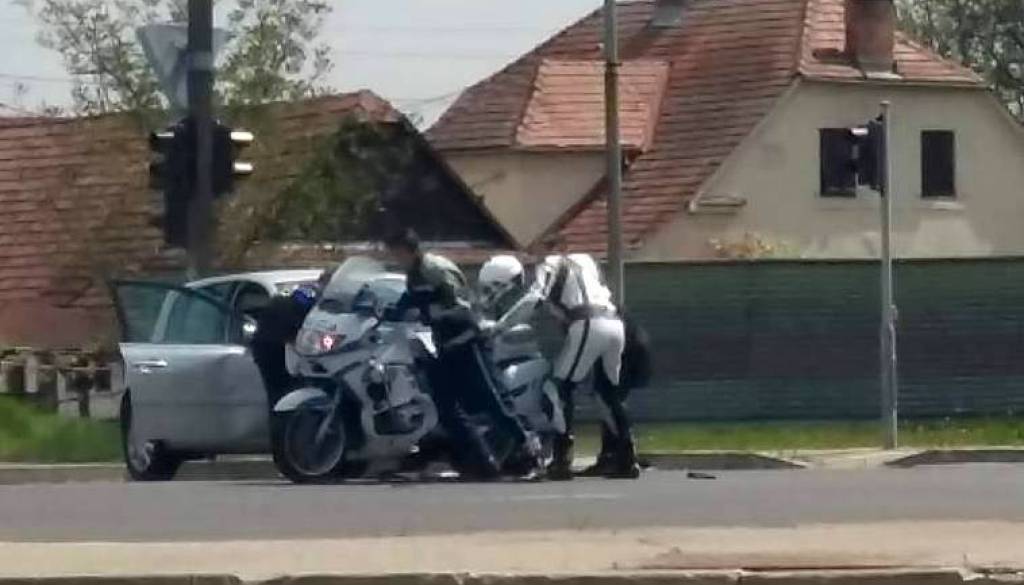 Policist na motorju je zavijal levo in tako zaprl pot voznici avtomobila, ki je pripeljala naravnost.