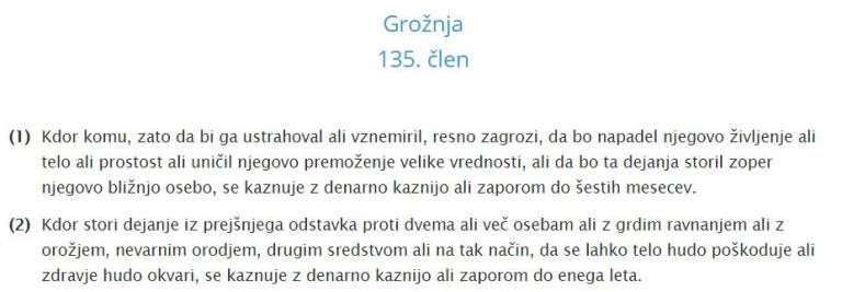 Učiteljici očitajo kaznivo dejanje grožnje po katerem ji grozi denarna kazen ali zapor do enega leta.