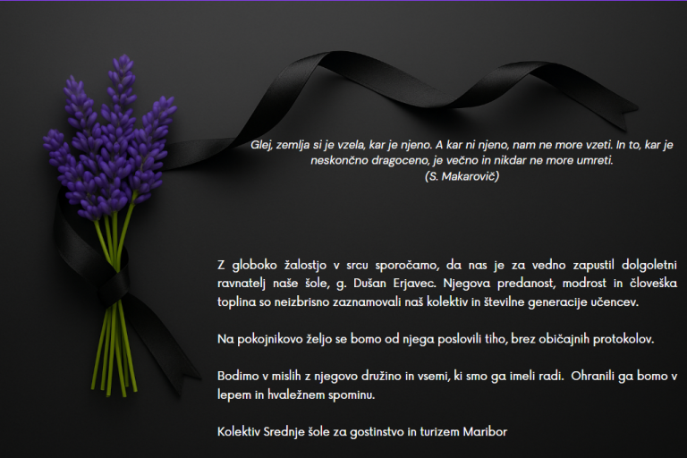 Srednja šola za gostinstvo in turizem Maribor je sporočila žalostno vest, da je za vedno odšel Dušan Erjavec, dolgoletni ravnatelj in nepogrešljiv člen šolskega kolektiva.