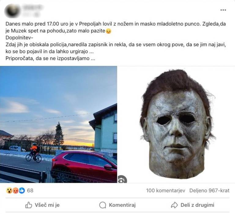 Tudi v Facebook skupini Starše – Za boljši jutri opozarjajo pred moškim v maski, ki naj bi lovil mladoletno punco. Avtorica objave je zapisala, da je o dogodku obveščena tudi policija, ki je naredila zapisnik.