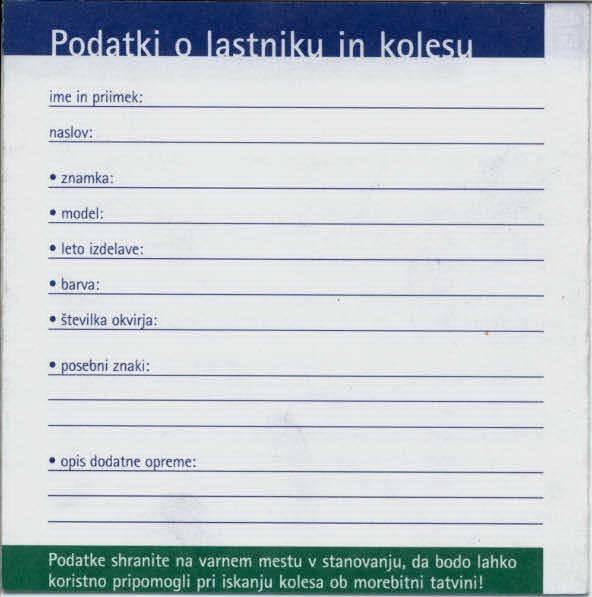 - Zapišite si podatke o kolesu (znamko, model in barvo kolesa, tudi tip sestavnih delov - pedal, ogrodja, prestav, zavor; morebitne posebnosti, individualne znake in poškodbe, dodatno opremo itd.); če kolo na okvirju nima serijske številke, jo dajte nanj vgravirati. Pri opisu si lahko pomagate z obrazcem Podatki o lastniku in kolesu.