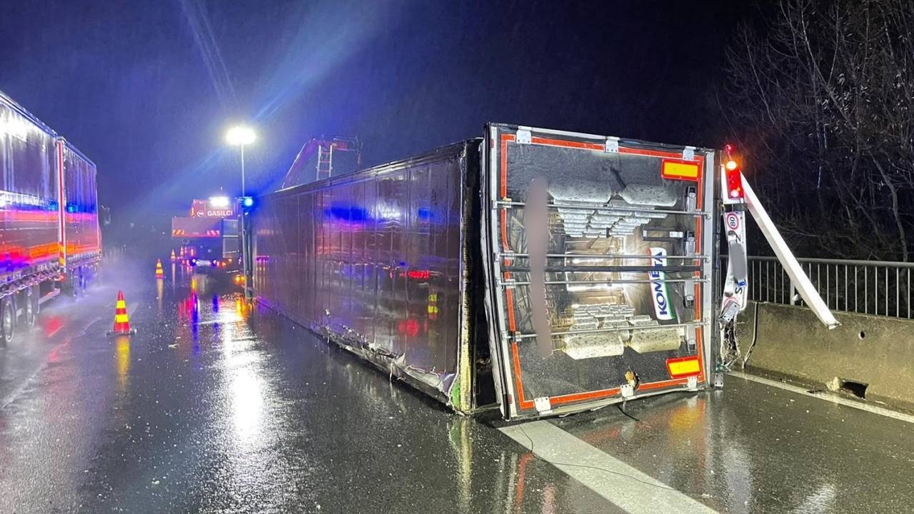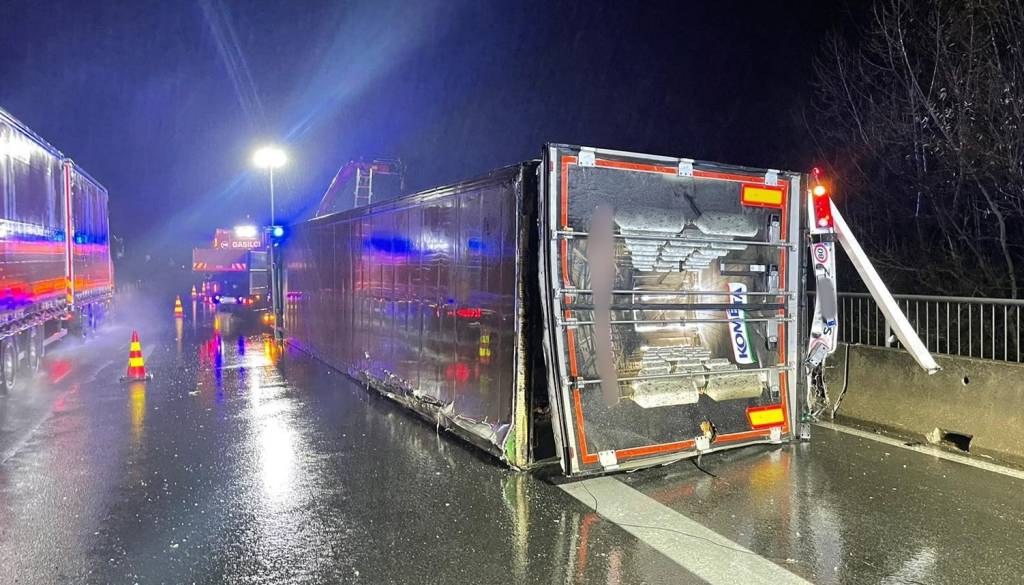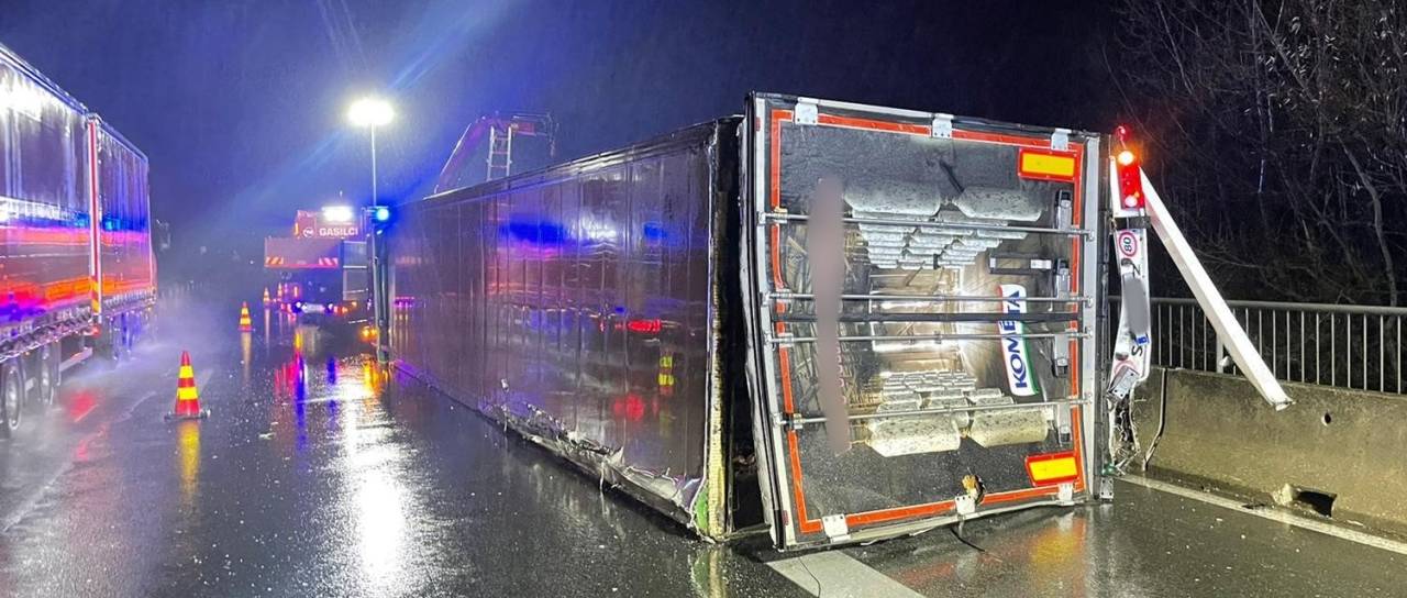 Pred izvozom Domžale se je tovorno vozilo s priklopnikom ob trku v obcestno ograjo prevrnilo na bok. Ena oseba je lažje poškodovana.