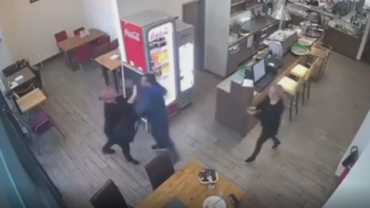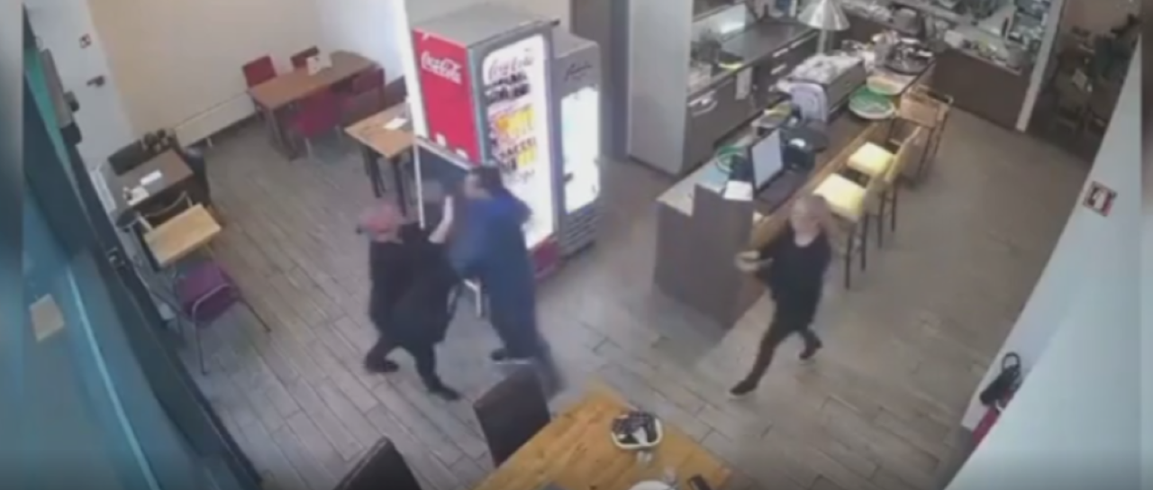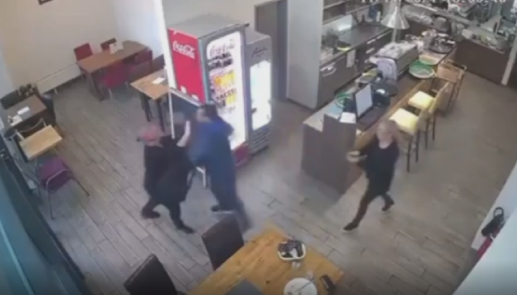 Prikazuje posnetek kamere v lokalu, kjer vidimo, kako ženska z rokami ustavlja moškega, ta jo pahne na tla, nato pa se pojavi drug moški, ki prvega spravi na tla in ga brca.