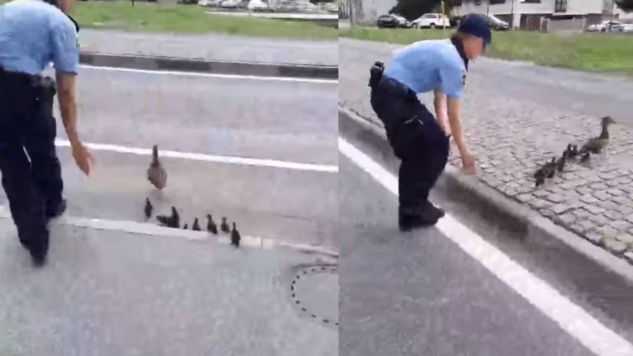 Policisti so ustavili promet in račji družini pomagali, da se je varno vrnila v potok, kjer domujejo.