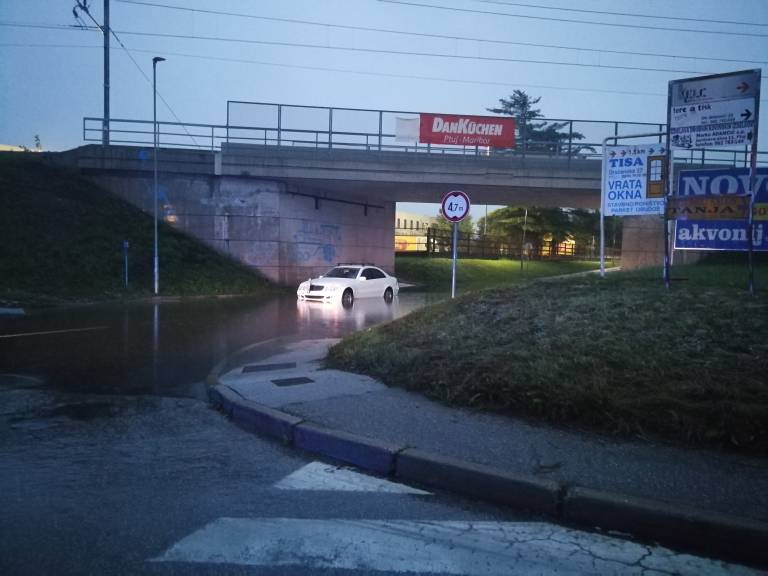 Včeraj je tudi poplavilo podvoz pod železniško progo na Bregu pri Ptuju, blizu Perutnine Ptuj. Osebno vozilo je obtičalo v vodi, pomagati so morale pristojne službe.