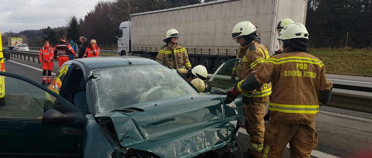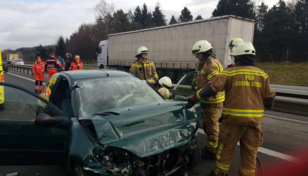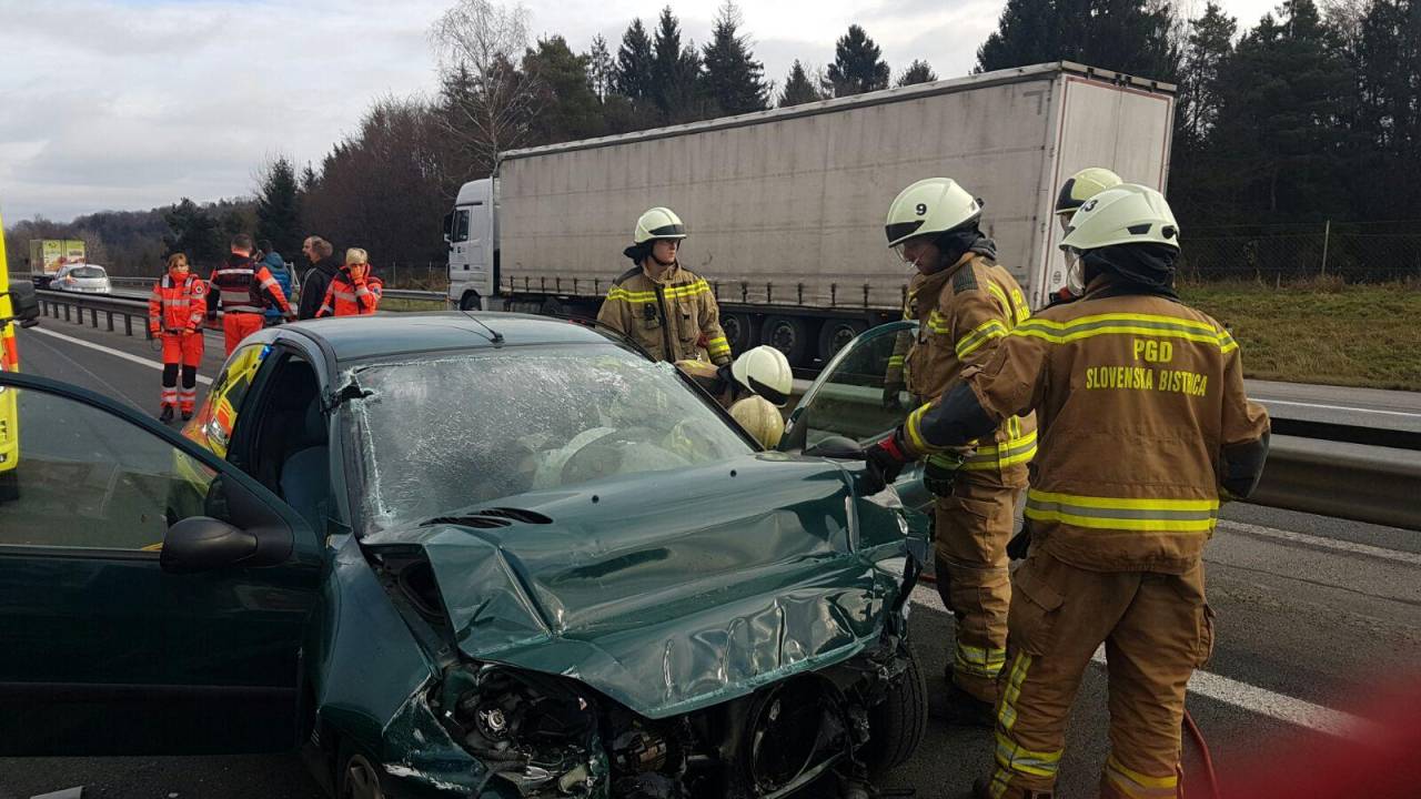 "Po trčenju je z osebnim avtomobilom zapeljala v levo, na prehitevalni pas, kjer je s sprednjim levim bočnim delom trčila v zaščitno kovinsko ograjo, ustavila pa se je na prehitevalnem pasu šele po približno 200 metrih. Voznica osebnega avtomobila je ostala na voznikovem sedežu, pripeta z varnostnim pasom, ukleščena v vozilu. Iz vozila so jo izrezali gasilci," so še sporočili iz Policijske uprave Maribor.