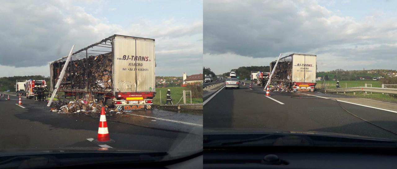 Na štajerski avtocesti med priključkoma Slovenska Bistrica – jug in Slovenska Bistrica – sever, v smeri proti Mariboru, je včeraj okoli 17.40 zagorelo priklopno tovorno vozilo, madžarskih registrskih oznak, ki ga je vozil 24-letni Madžar.