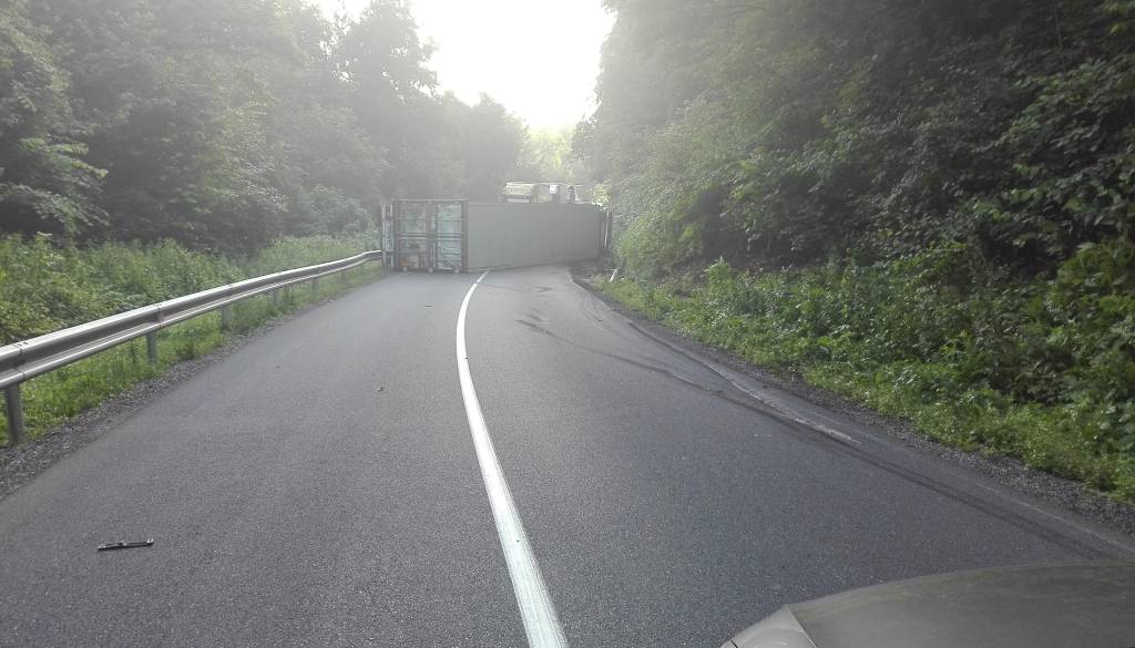 Zaradi prometne nesreče tovornega vozila je bila od jutra popolnoma zaprta cesta Dolane - Zavrč.