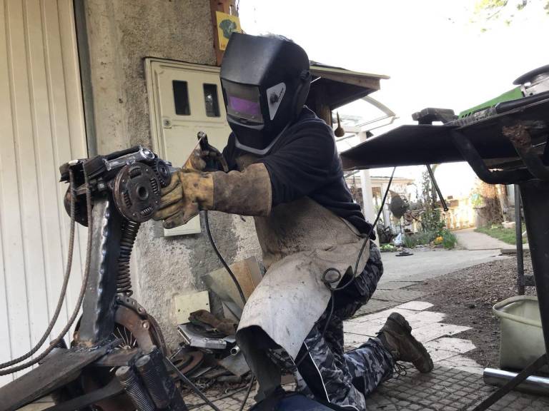 Vsak sestavni del svojih umetnin najprej natančno pomeri in ga nato tudi natančno odreže. Stare klešče bodo tako postale nova čeljust konjička. Vse to pa Marjanu uspeva brez leve roke, ki jo je zaradi eksplodirane granate izgubil še kot otrok. Protezo si nadene le redko.
