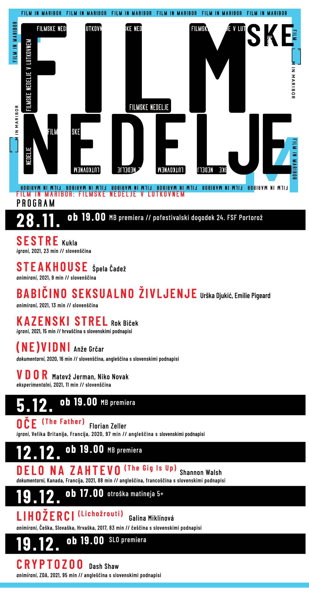 Ob sledečih nedeljah bodo premierno v Mariboru vrteli še: 5. decembra eden najodmevnejših filmov leta, z dvema oskarjema (za najboljši scenarij in glavno moško vlogo Anthonyja Hopkinsa) nagrajeni Oče; 12. decembra še kako aktualen dokumentarec Delo na zahtevo o spletnih platformah, kot so Wolt, Uber in Amazon; 19. decembra dva izjemna animirana filma – prvič v Sloveniji v Sundancu nagrajeni animirani celovečerec Kriptozoo, za otroke pa češka uspešnica Lihožerci.