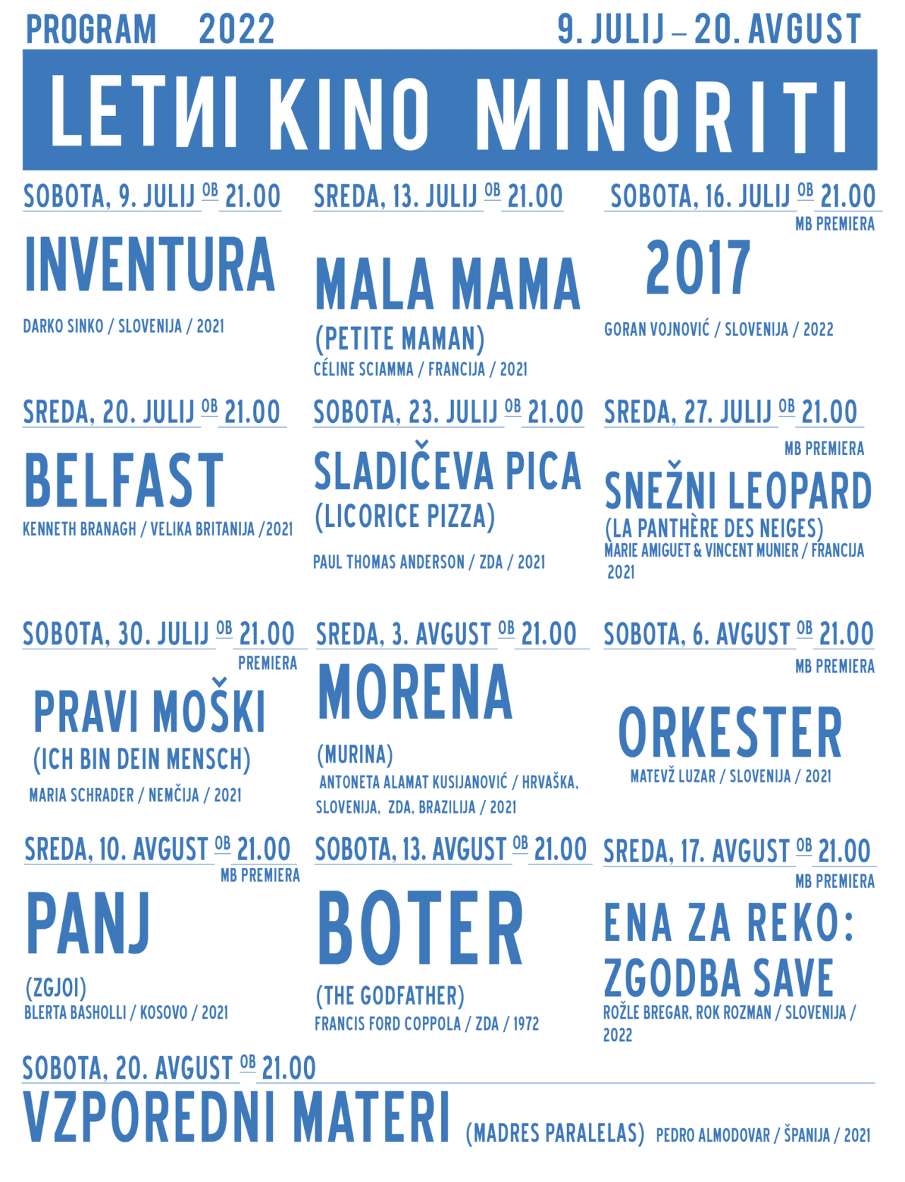 Med vrhunci se obeta 50-letnica Botra, hrvaško-slovenska nagrajenka iz Cannesa Morena, najboljši slovenski film leta Inventura in pogovor z režiserjem Darkom Sinkom, mariborske premiere filmov 2017, Belfast, Orkester in Zgodba Save, nova mojstrovina Celine Sciamma Mala mama in še mnogo več.