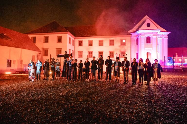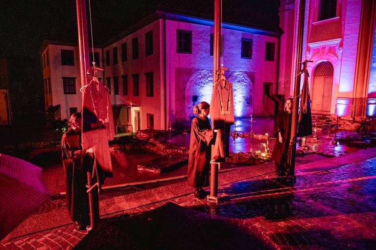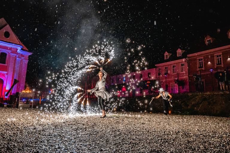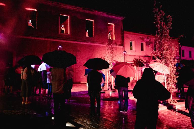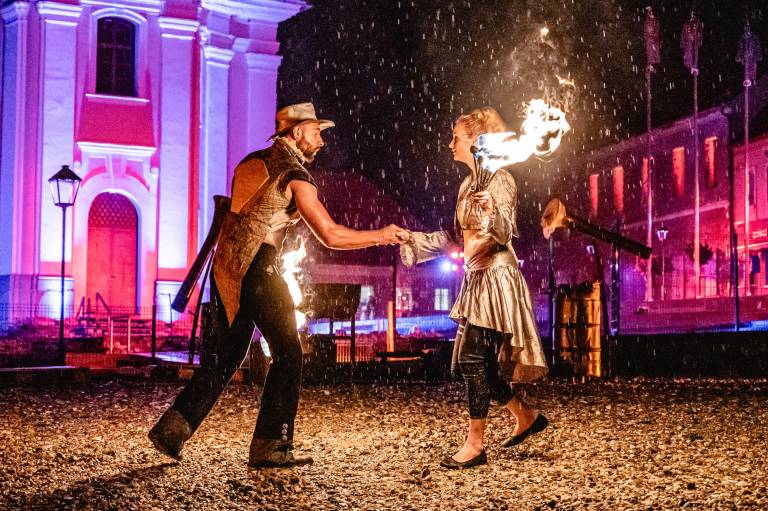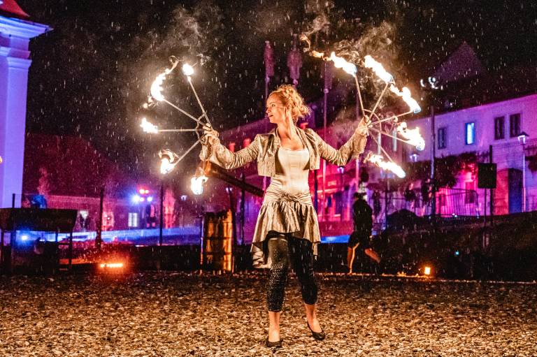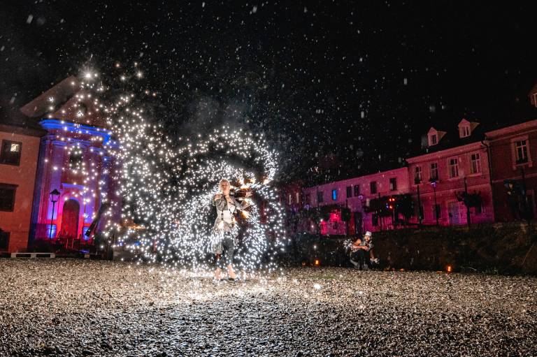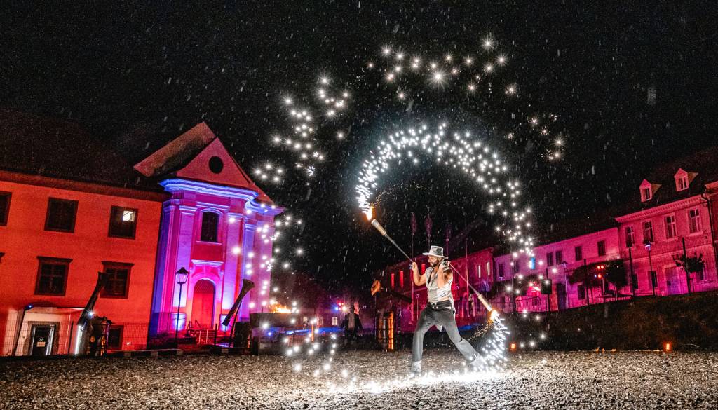 Skrbno prenovljen je Vojašniški trg sinoči vstopil v svoje novo življenje, v soju reflektorjev ulično-gledališkega spektakla Srečanja v času.