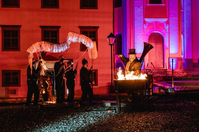 Prenovljeni Vojašniški trg so sinoči otvorili z ulično predstavo po motivih ljudske pripovedke o kačji kraljici.
